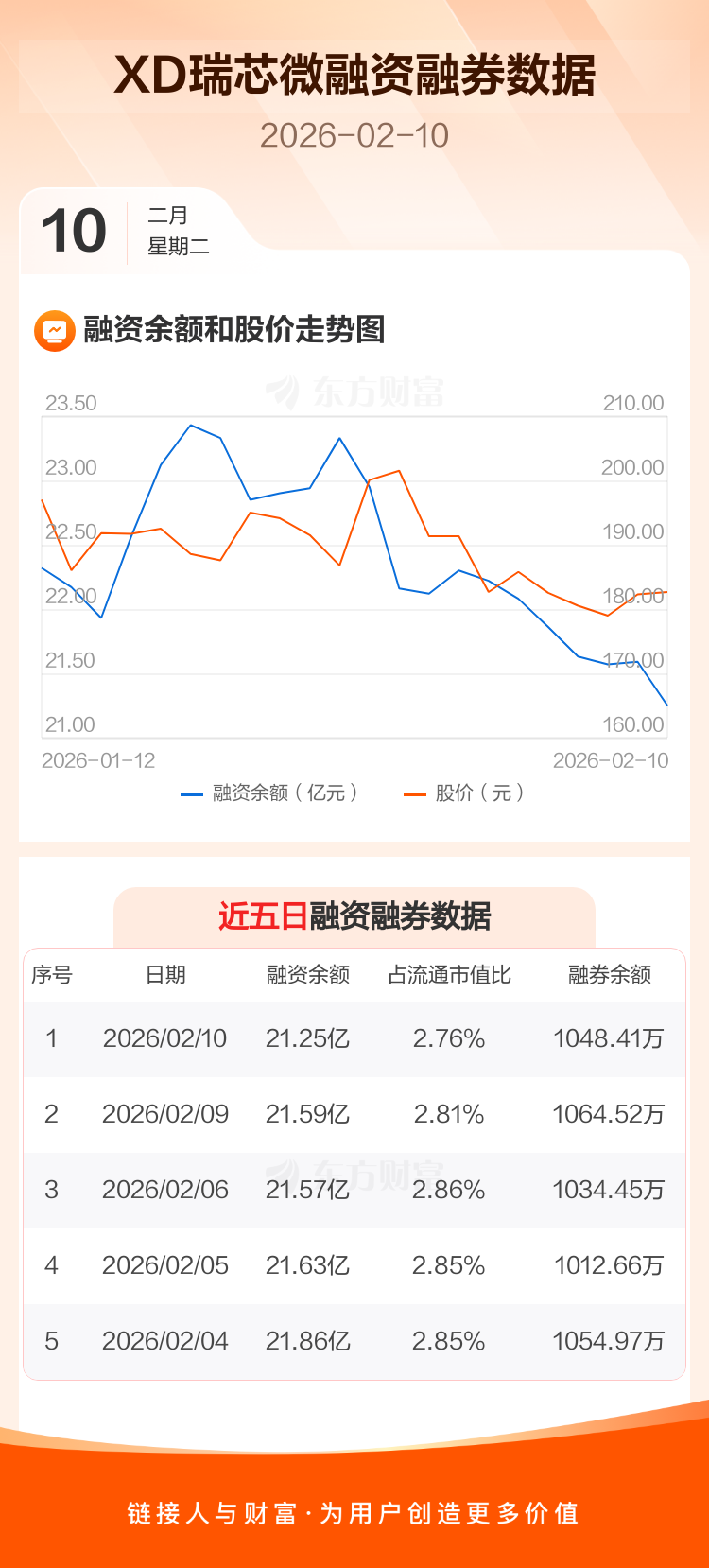 交易所最新数据显示,XD瑞芯微于2026年2月10日获融资买入8878.19万元,融资偿还1.23亿元,当日融资净偿还3406.06万元。目前,该股融资余额21.25亿,占流通市值比例为2.76%。