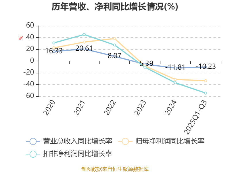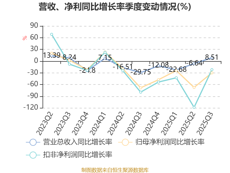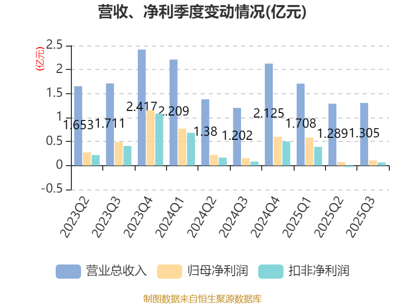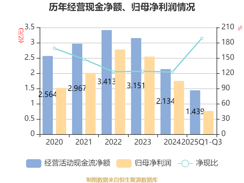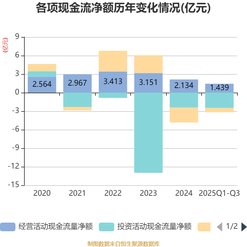 2025年前三季度,公司经营活动现金流净额为1.44亿元,同比增长0.64%;筹资活动现金流净额-6927.32万元,同比增加1.75亿元;投资活动现金流净额-2.48亿元,上年同期为2.2亿元。