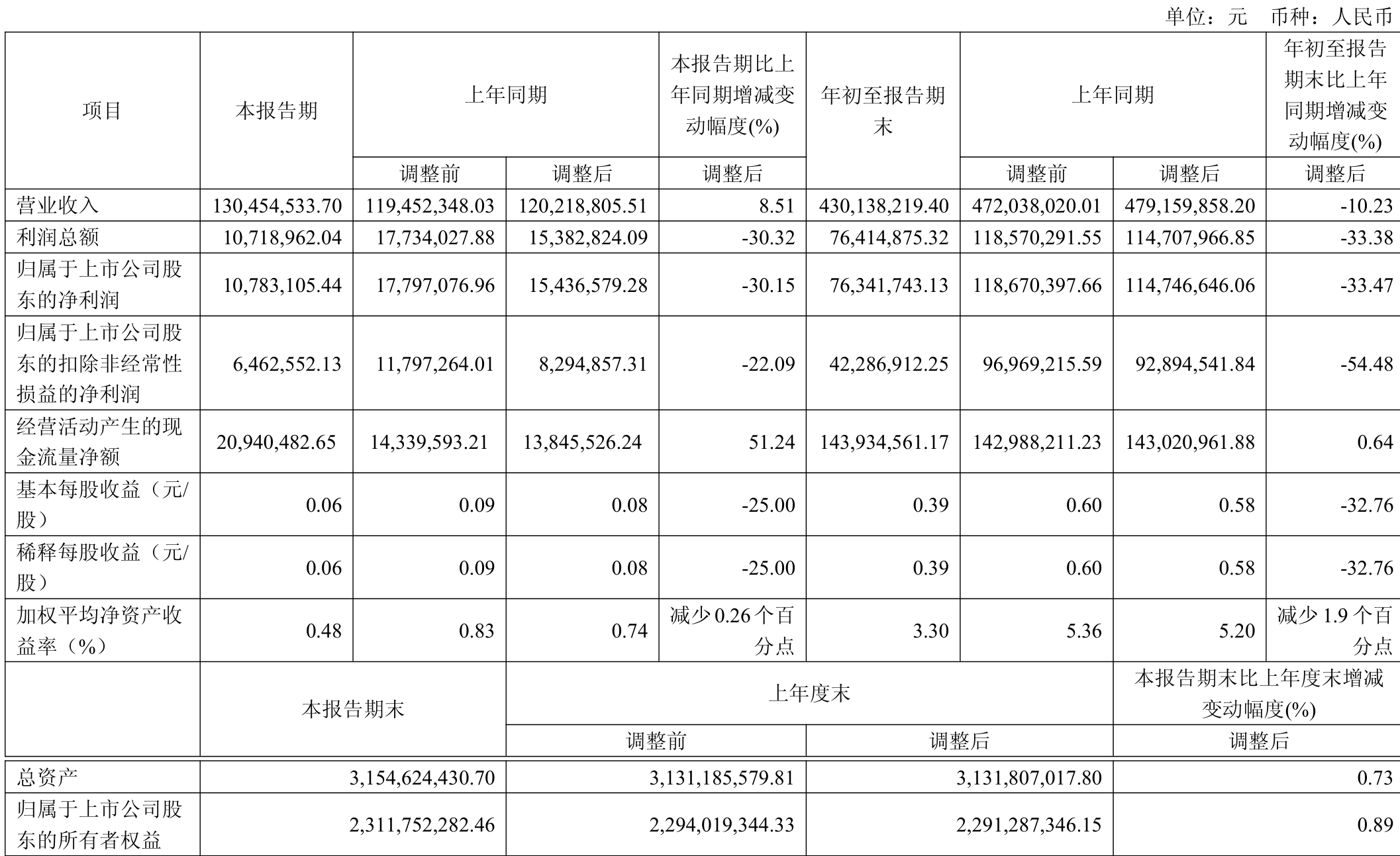 中证智能财讯寿仙谷(603896)10月29日披露2025年第三季度报告。前三季度公司实现营业总收入4.3亿元,同比下降10.23%;归母净利润7634.17万元,同比下降33.47%;扣非净利润4228.69万元,同比下降54.48%;经营活动产生的现金流量净额为1.44亿元,同比增长0.64%;报告期内,寿仙谷基本每股收益为0.39元,加权平均净资产收益率为3.30%。