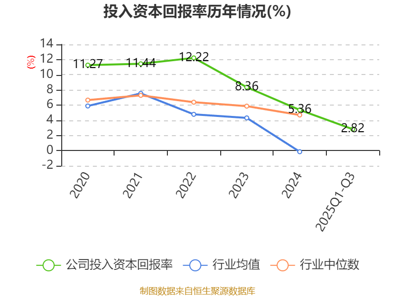 盈利能力方面, 2025年前三季度公司加权平均净资产收益率为3.3%,同比下降1.9个百分点。公司2025年前三季度投入资本回报率为2.82%,较上年同期下降0.7个百分点。