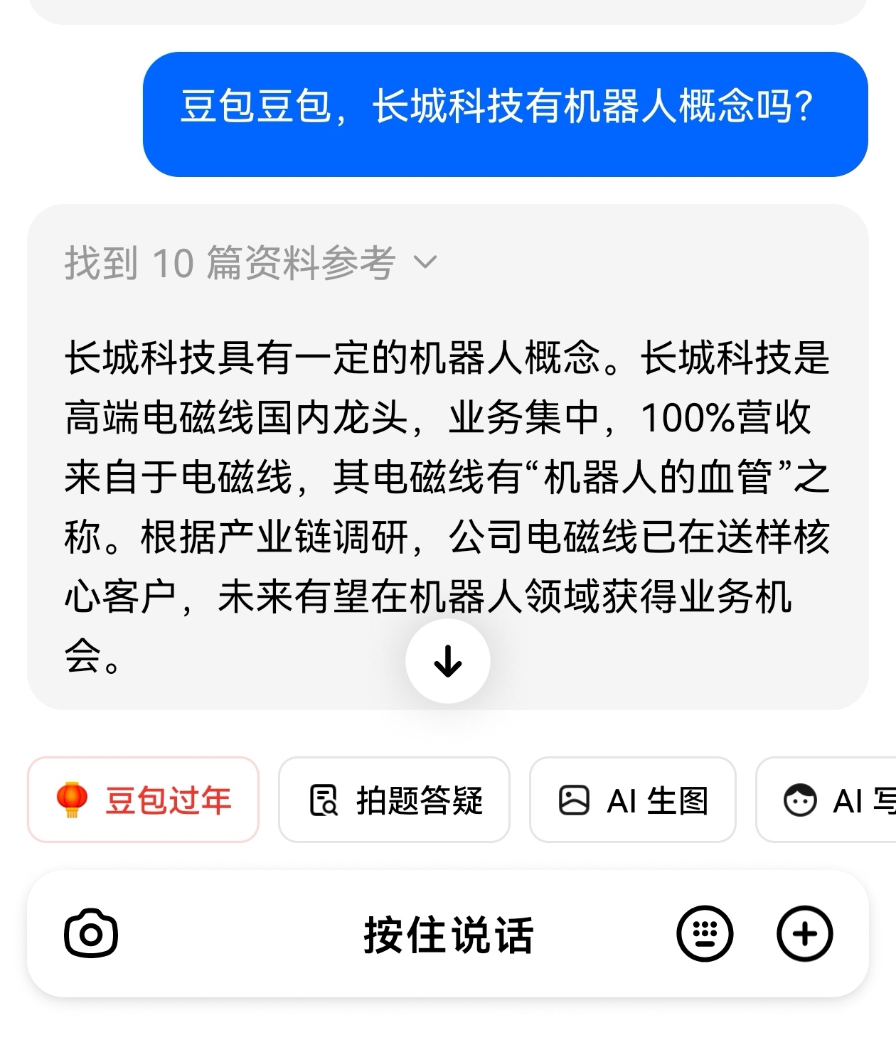 $长城科技(SH603897)$ 问豆包说是长城科技可用于机器人的电磁线送样了