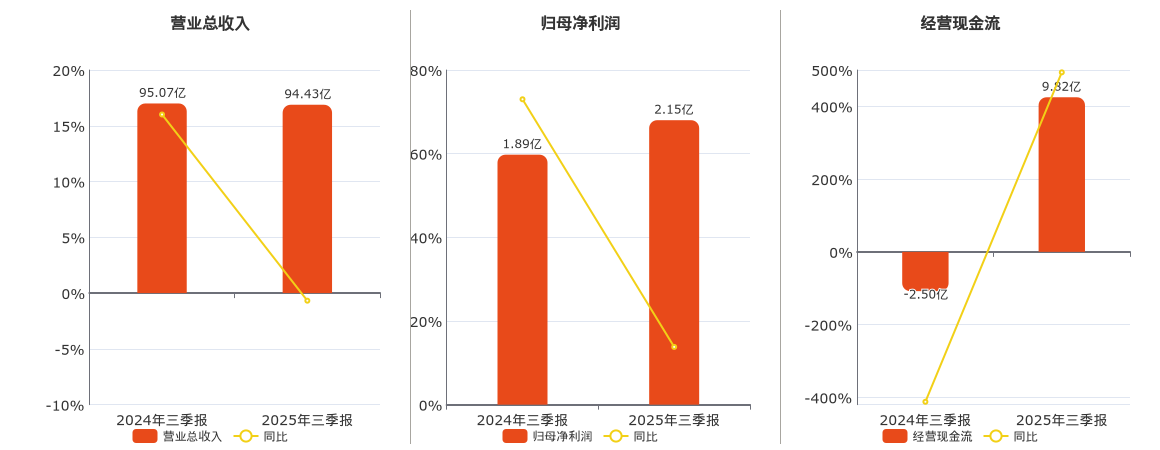 公司营业总收入为94.43亿元,较去年同报告期营业总收入减少6479.86万元,同比较去年同期下降0.68%。归母净利润为2.15亿元。经营活动现金净流入为9.82亿元。