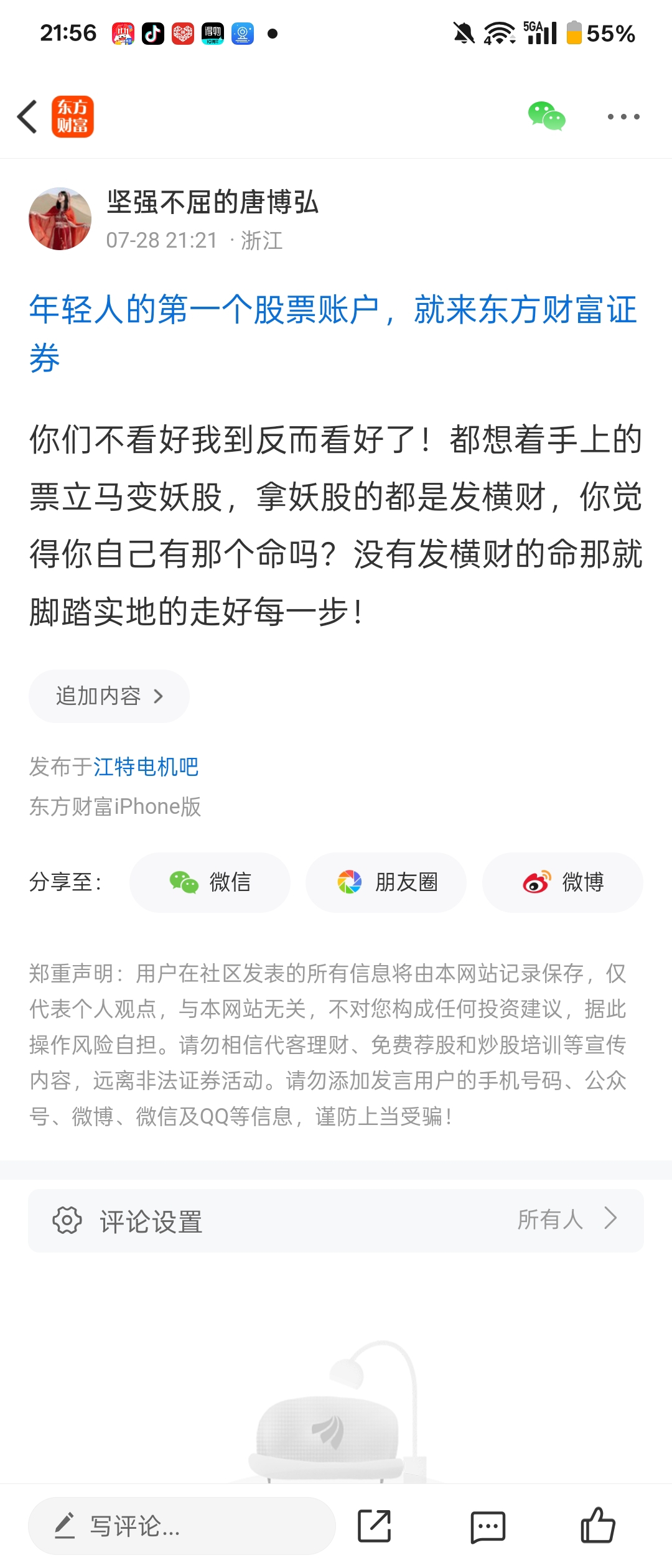 温馨提示: 1.根据《证券法》规定,禁止编造、传播虚假信息或者误导性信息,扰乱证券市场;2.用户在本社区发表的所有资料、言论等仅代表个人观点,与本网站立场无关,不对您构成任何投资建议。用户应基于自己的独立判断,自行决定证券投资并承担相应风险。《东方财富社区管理规定》