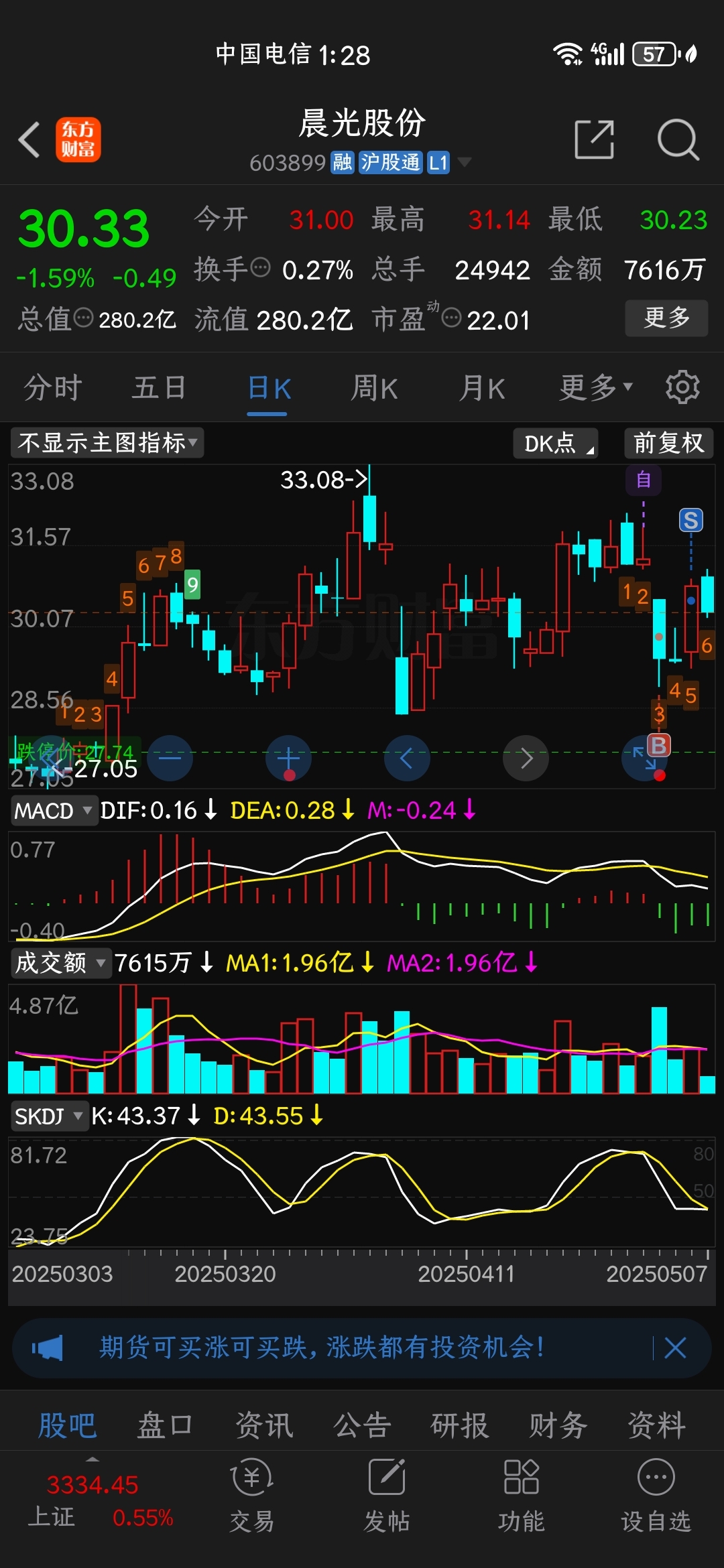 $晨光股份(SH603899)$ 最近千万不能格局,有赚就得跑
