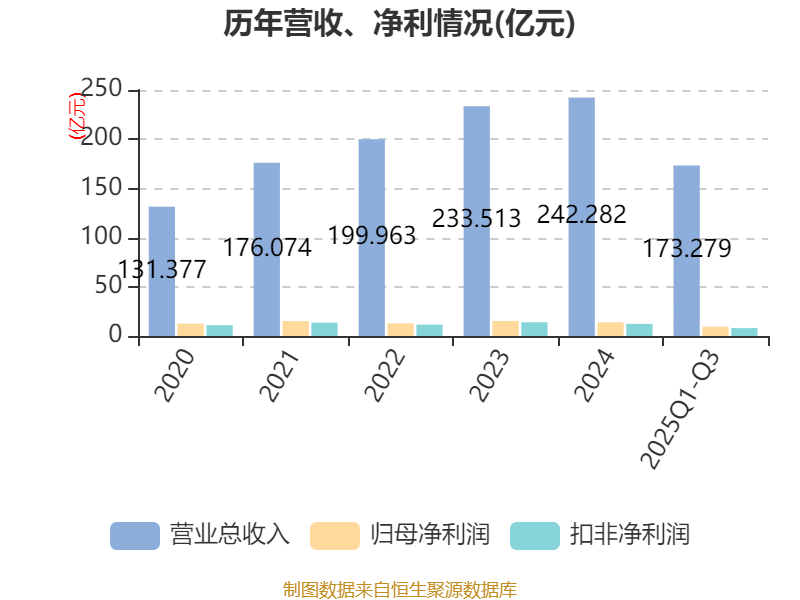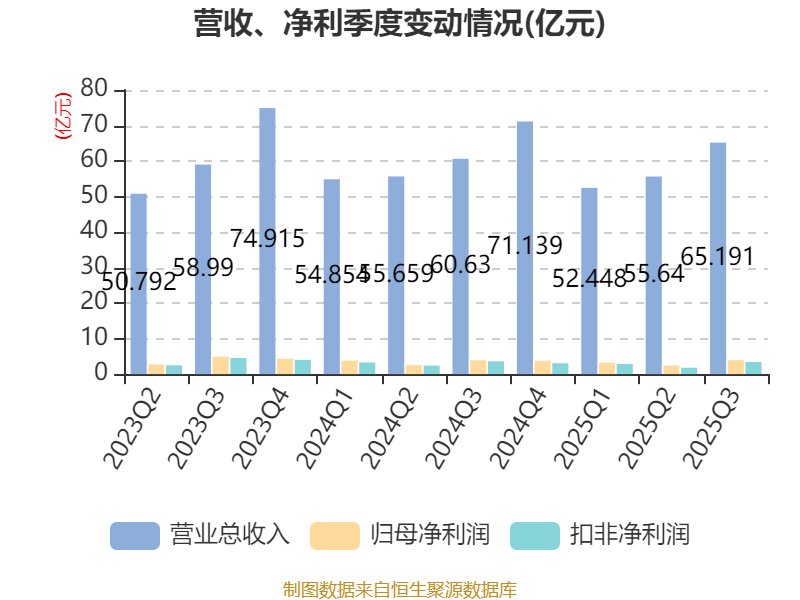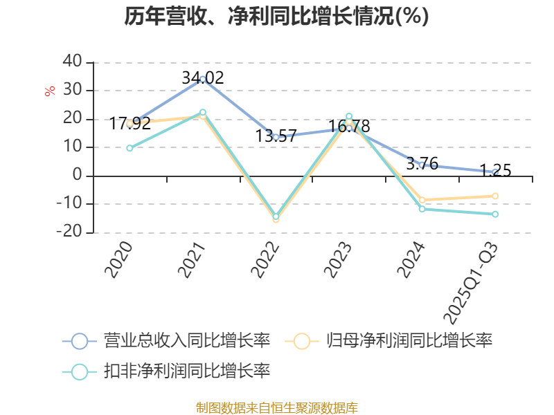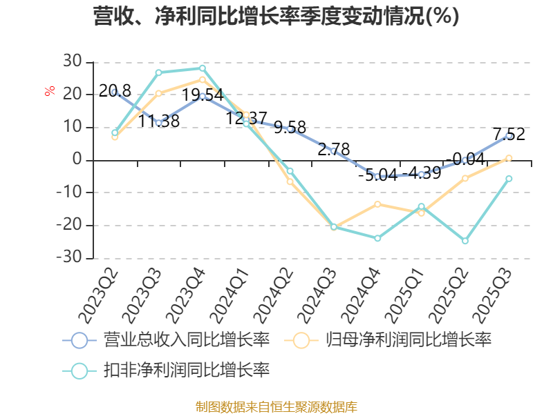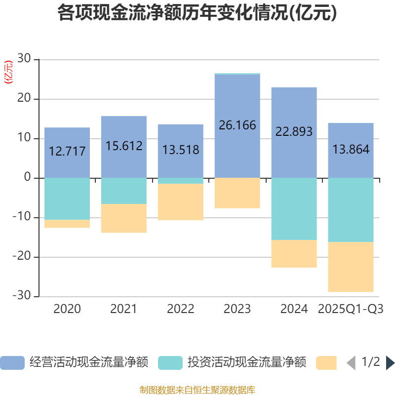 2025年前三季度,公司经营活动现金流净额为13.86亿元,同比下降2.42%;筹资活动现金流净额-12.63亿元,同比减少7.13亿元;投资活动现金流净额-16.3亿元,上年同期为-10.4亿元。