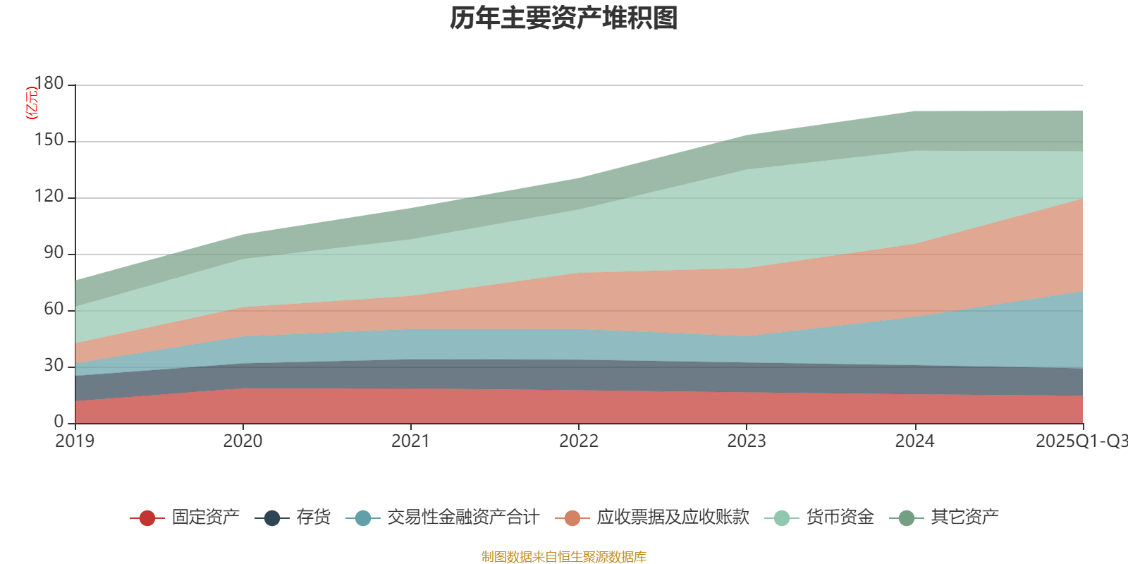 资产重大变化方面,截至2025年三季度末,公司货币资金较上年末减少49.25%,占公司总资产比重下降14.76个百分点;交易性金融资产合计较上年末增加59.44%,占公司总资产比重上升9.16个百分点;应收票据及应收账款较上年末增加27%,占公司总资产比重上升6.26个百分点;其他流动资产较上年末减少55.78%,占公司总资产比重下降0.82个百分点。