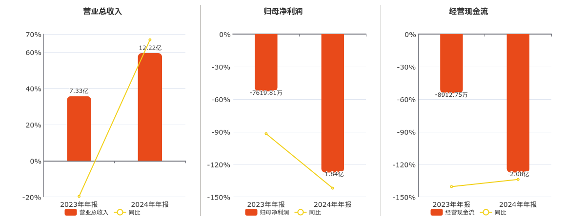 公司营业总收入为12.22亿元。归母净利润为-1.84亿元,较去年同报告期归母净利润减少1.08亿元。经营活动现金净流入为-2.08亿元,较去年同报告期经营活动现金净流入减少1.19亿元。