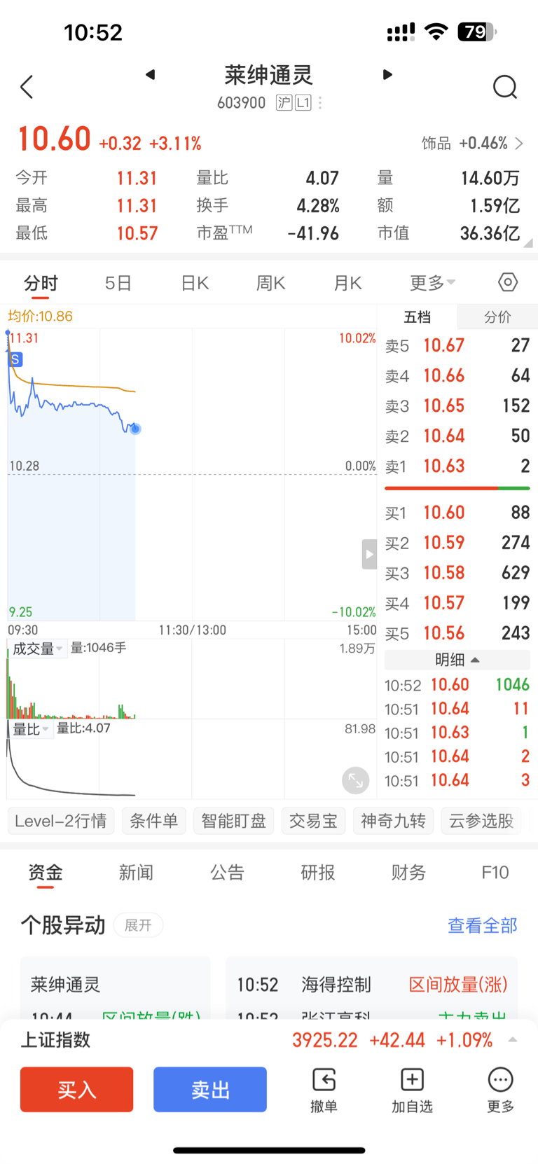 $莱绅通灵(SH603900)$ 就是^-^知道是个3秒男,开盘就扔了
