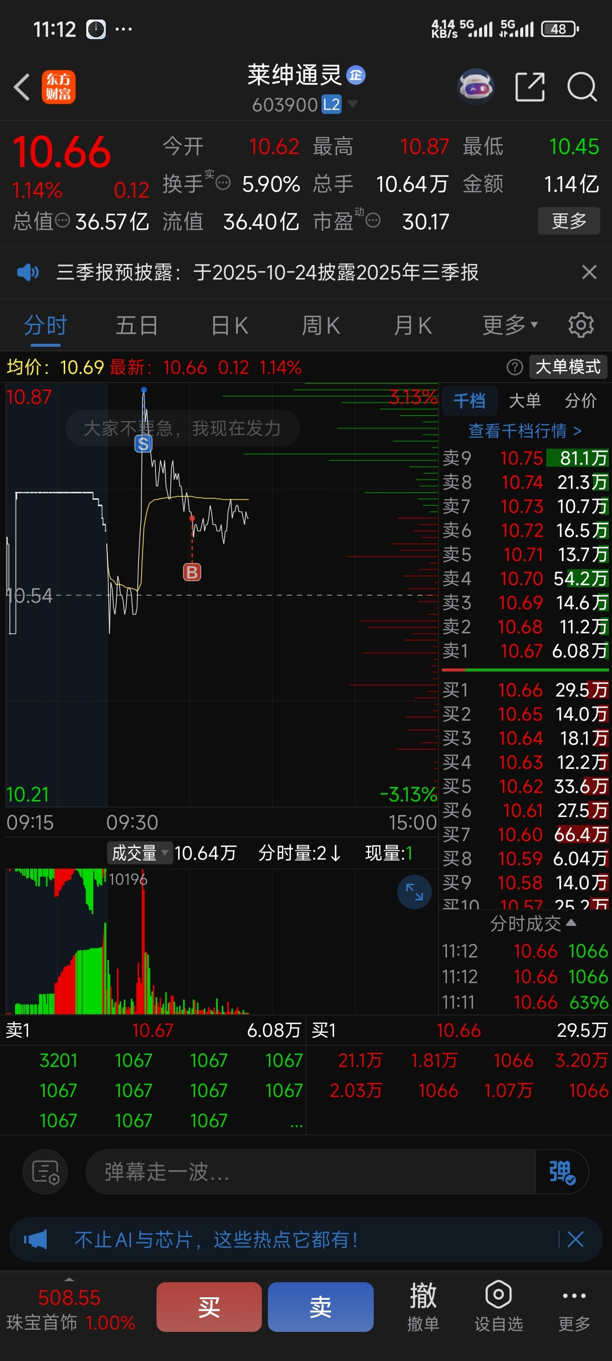 $莱绅通灵(SH603900)$ 今天赚了两包华子,炒股不能太贪,一天生活费很满足啊
