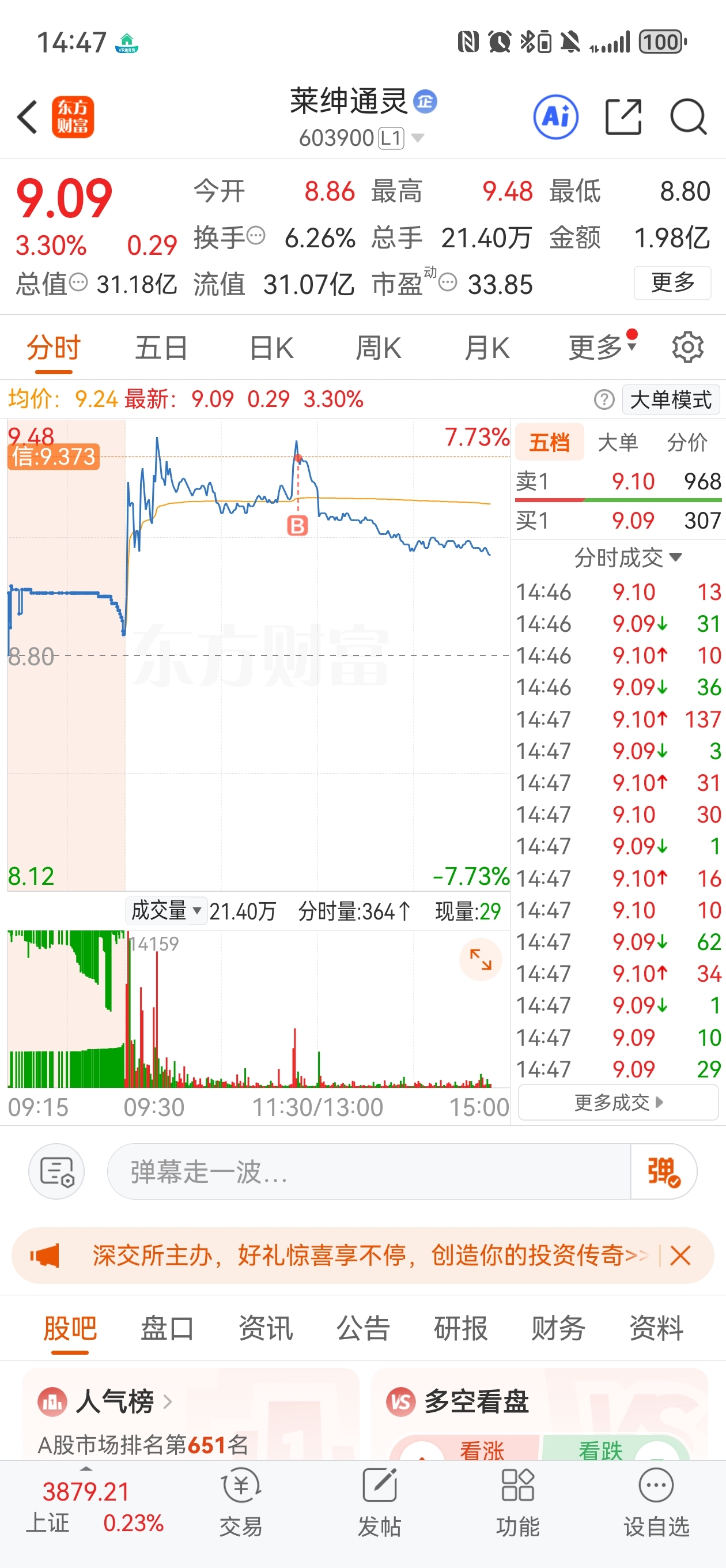 $莱绅通灵(SH603900)$ 不好意思,我买崩的