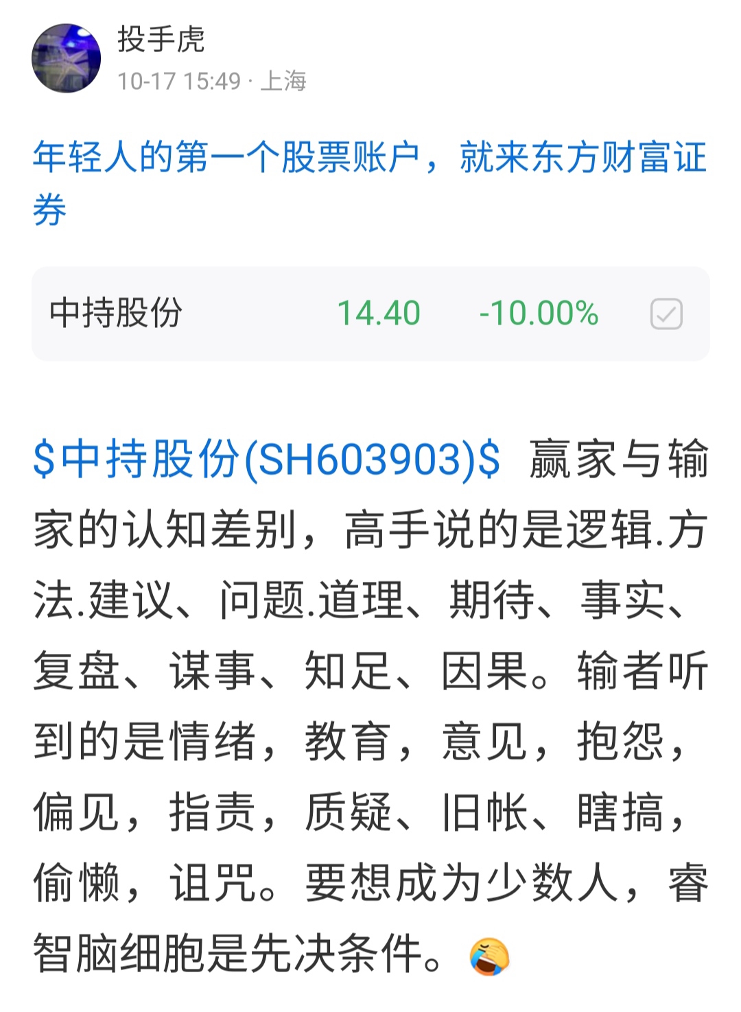 $中持股份(SH603903)$ 有些人总把自己凌驾于这个市场之上,盲目且自大,开盘前一片,根本听不懂弦外之音,总想跑在最高点,买在最低点,痴人说梦,最后的结局就是成为股市的大多数人。