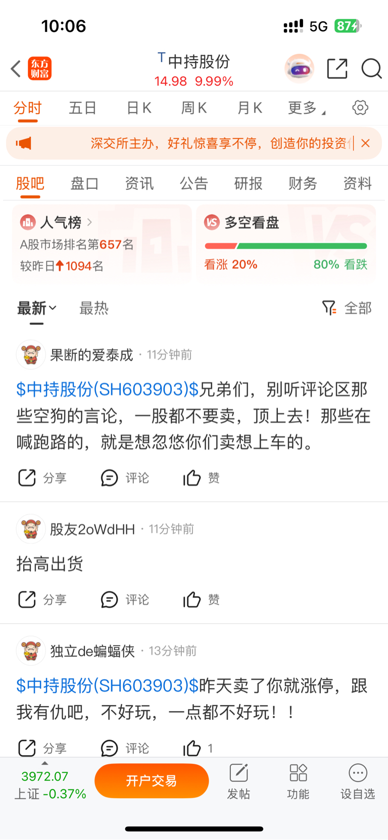 $中持股份(SH603903)$ 80%看空,他涨停了