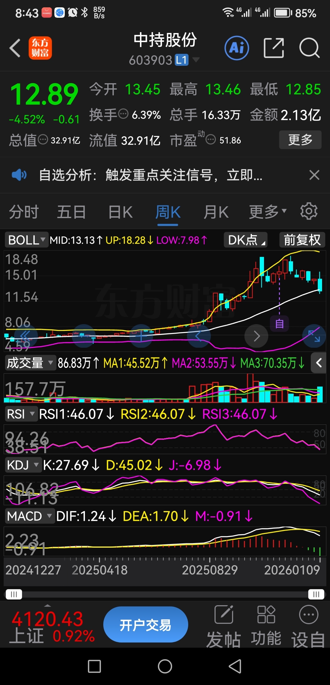 周一买中持14.12,事后看,周线潜伏早了些,出公告~芯长征入住,市场不认可,周
