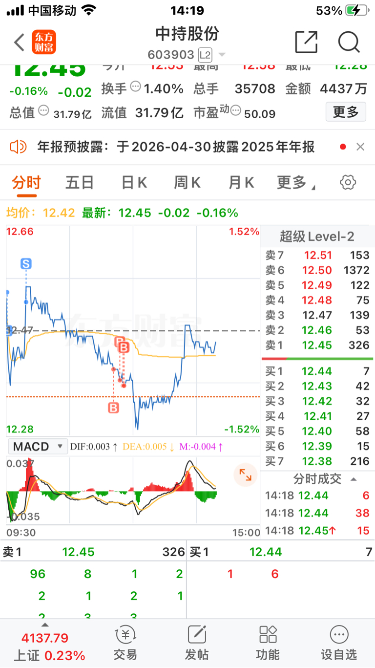 $中持股份(SH603903)$ 12.3就是底,跟上节奏,天天吃肉肉