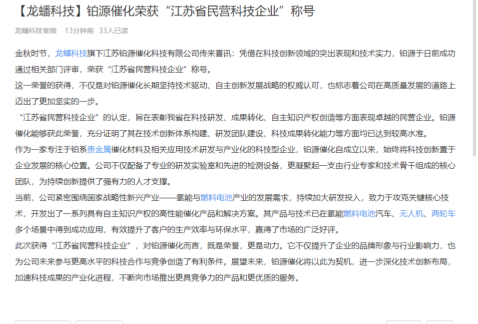 氢能:铂源催化荣获“江苏省民营科技企业”称号!