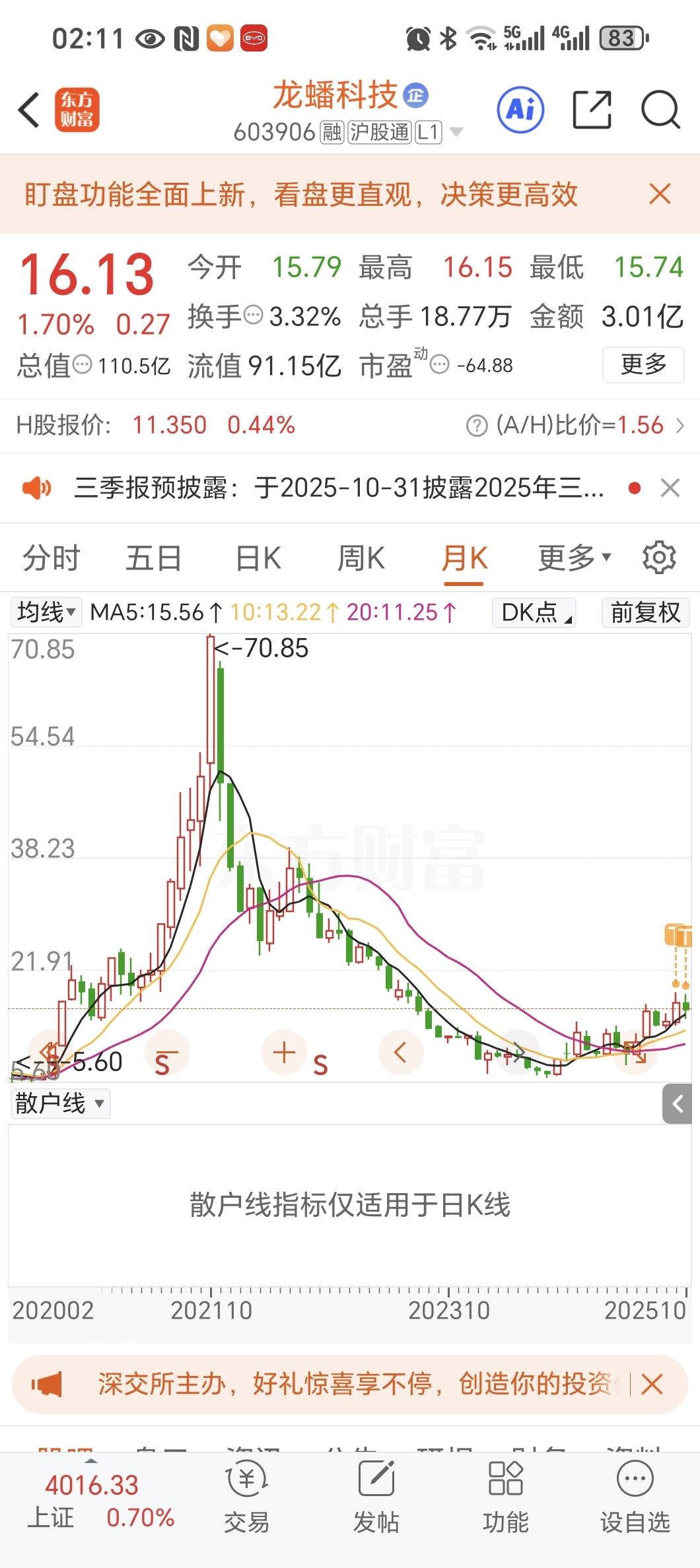 $龙蟠科技(SH603906)$ 月线来看应该还是走上升趋势