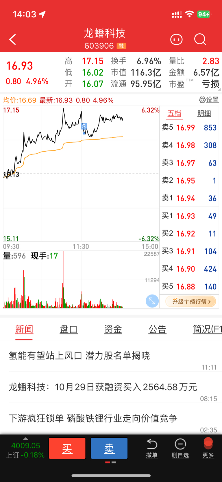 $龙蟠科技(SH603906)$ 被吓怕,16.74出来了。又给V上去了