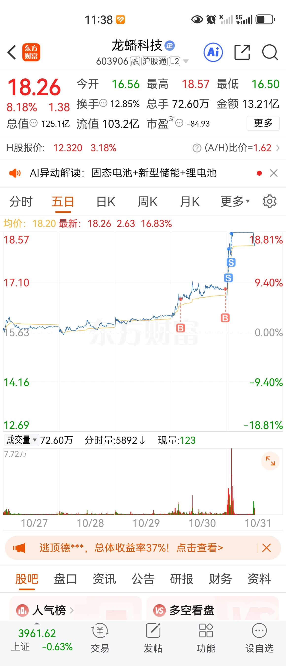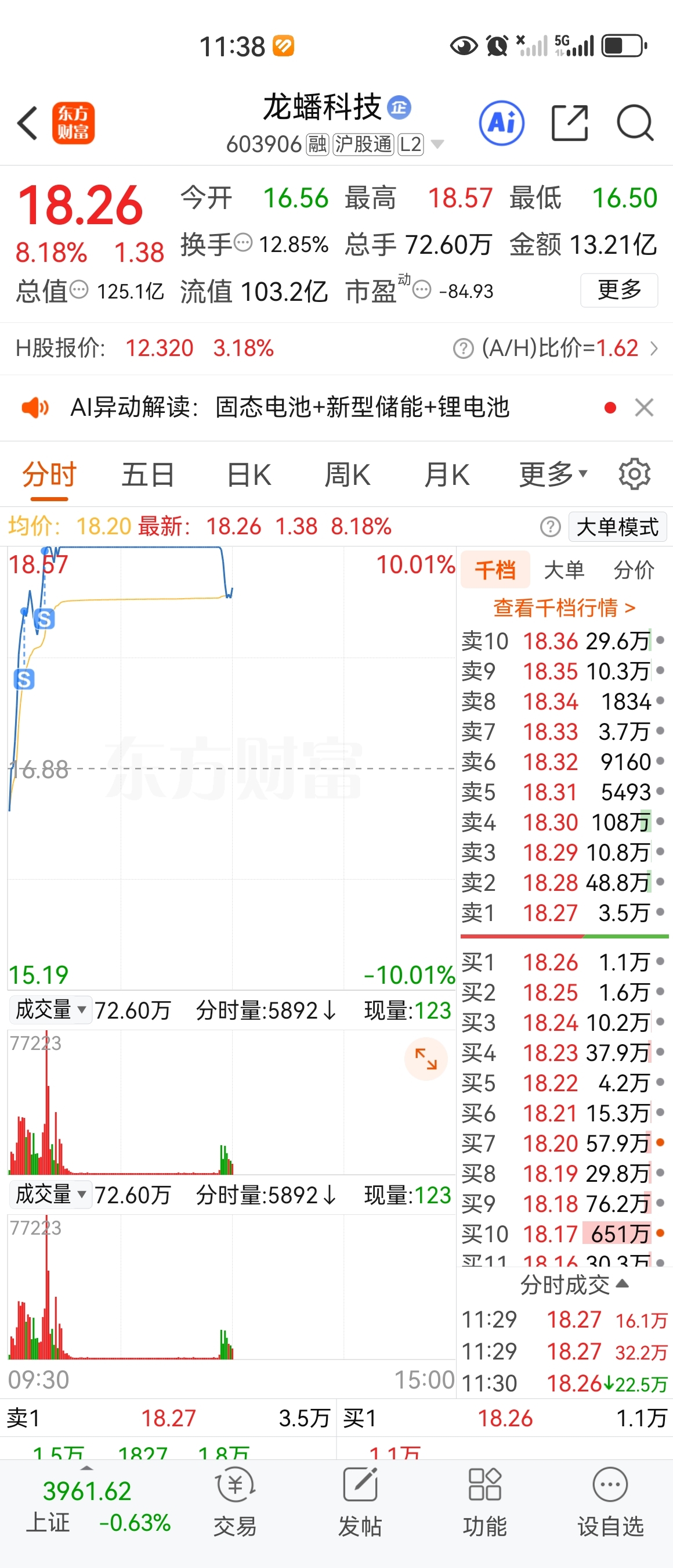 $龙蟠科技(SH603906)$ 昨天我发帖说赌一下,感谢主力吃肉离场