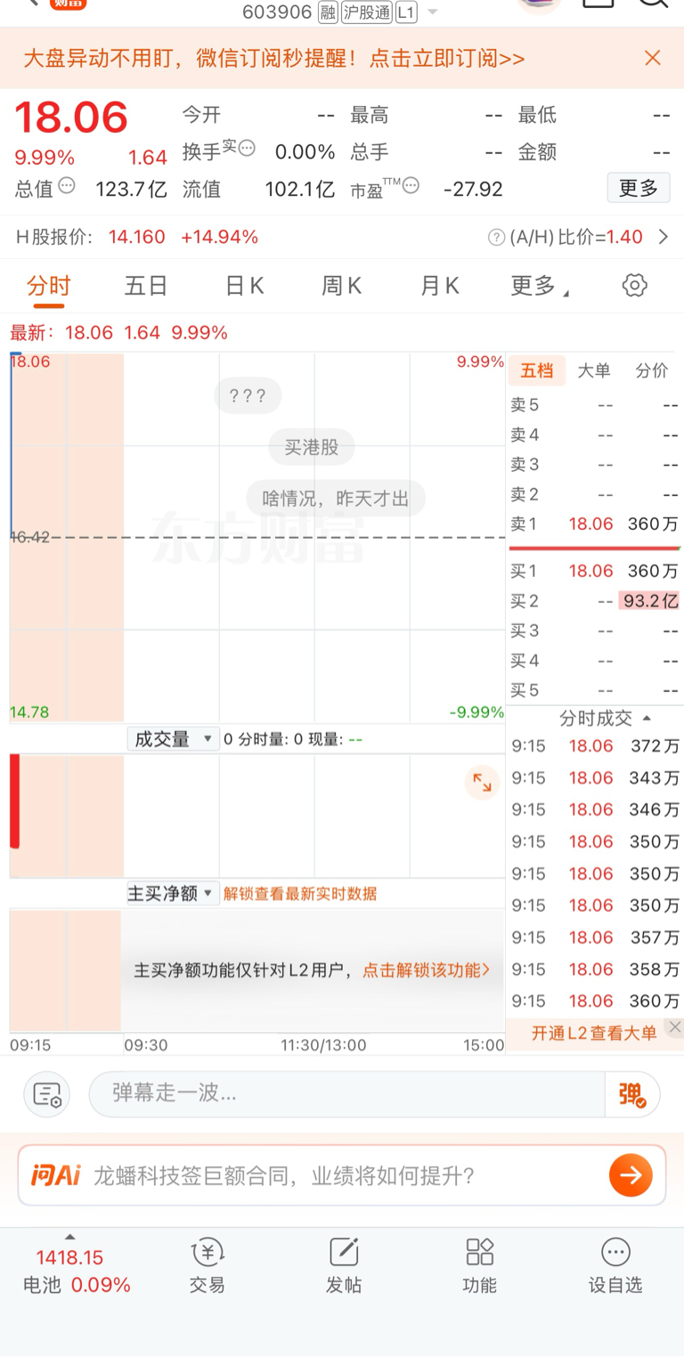 $龙蟠科技(SH603906)$ 瞬时封单一百亿,买不进去,只能撤单买别的