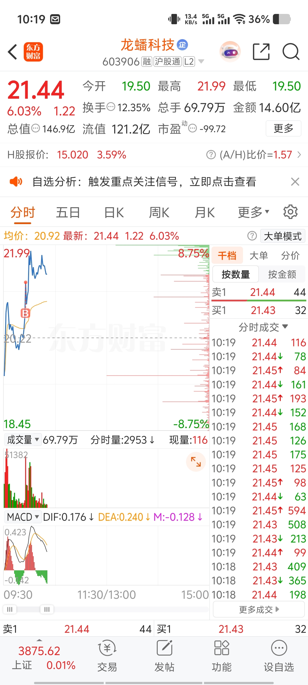 $龙蟠科技(SH603906)$ 真服了本来20.3的价格能拿到的,没有量化拉的快,最后21.28才买上,价格笼子对散户有点不友好