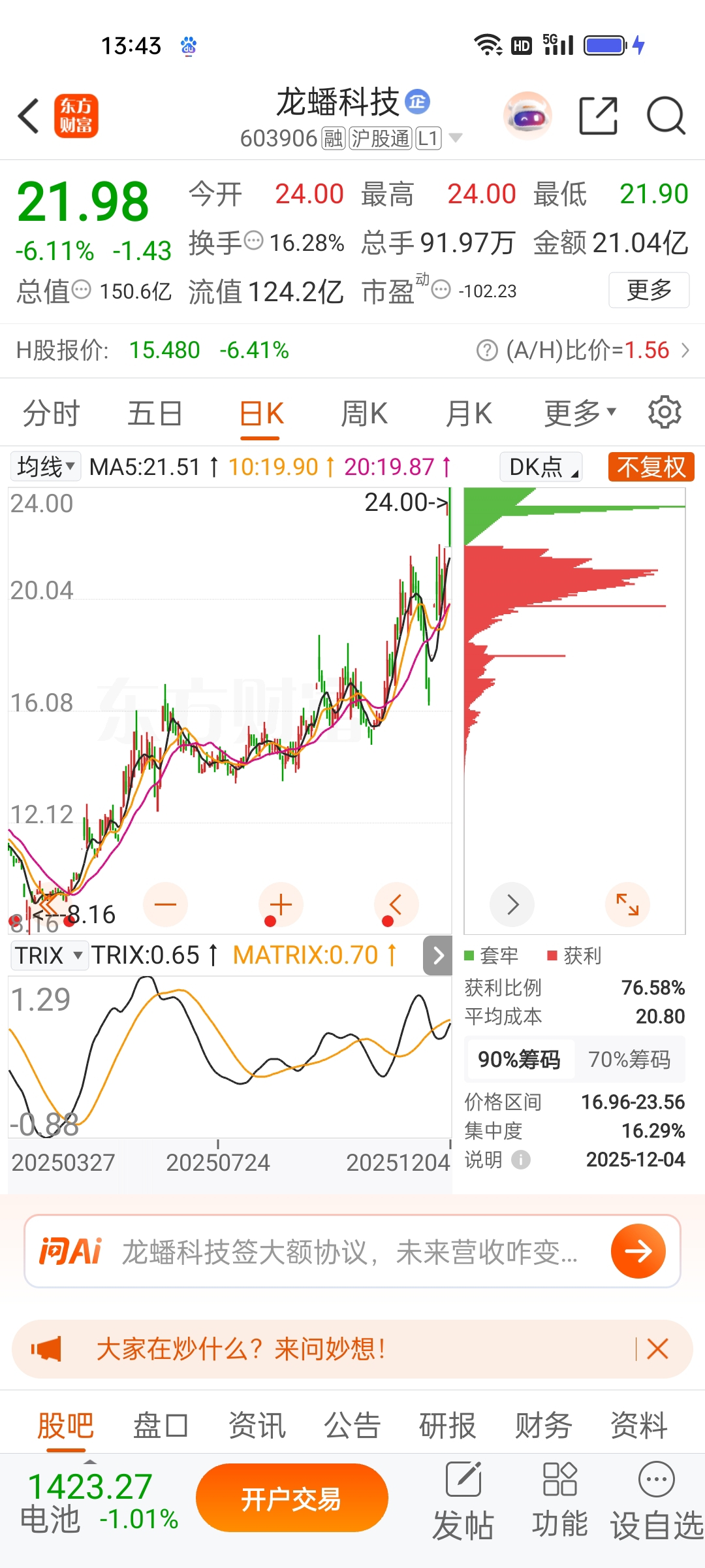 $龙蟠科技(SH603906)$ 从8块涨到24多,都涨了2倍了获利盘太多了,要小心了