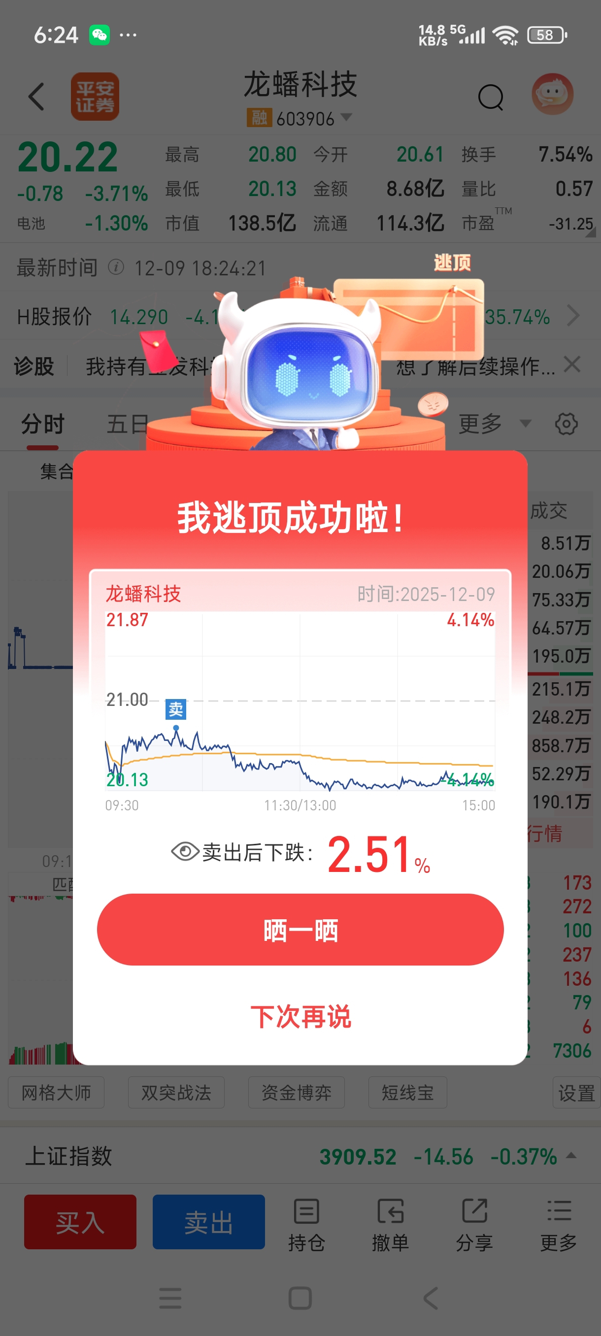 $龙蟠科技(SH603906)$ 虽然也是割肉,卖在最高点也是一种欣慰吧