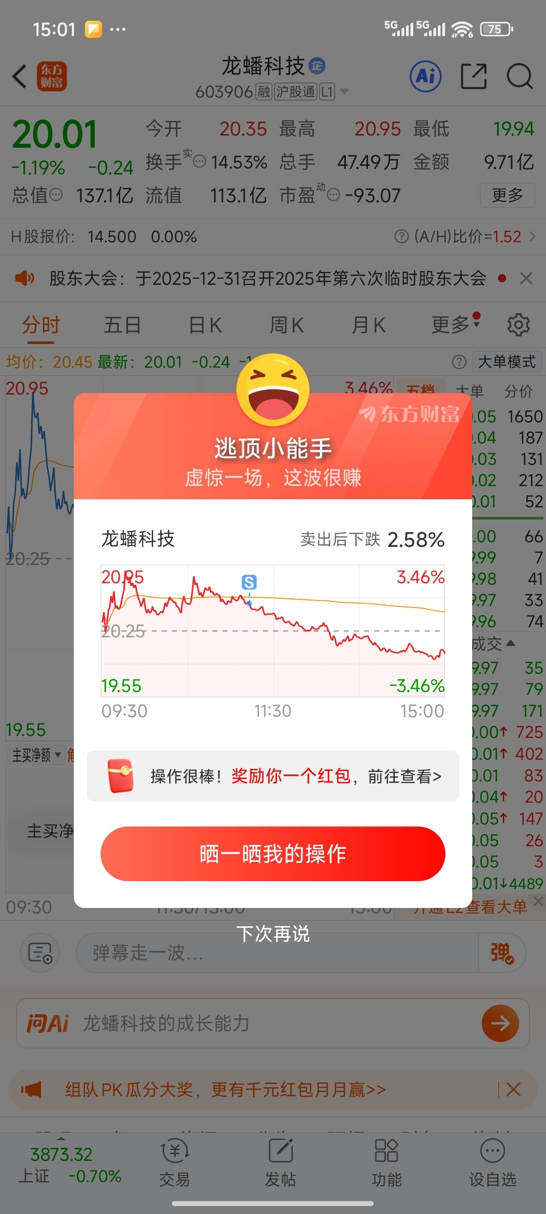 $龙蟠科技(SH603906)$ 明天应该会涨,因为平时我一卖,第二天就开始涨,祝大家发财,小亏1个点跑路