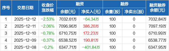 牧高笛:融资净偿还64.34万元,融资余额7032.61万元(12-12)