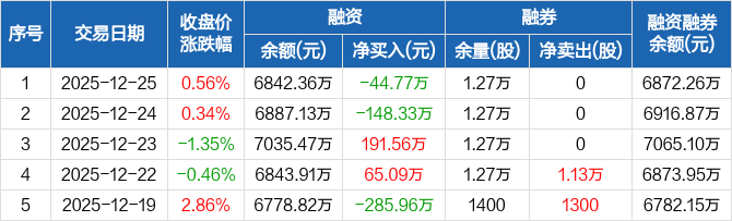 牧高笛:融资净偿还44.77万元,融资余额6842.36万元(12-25)