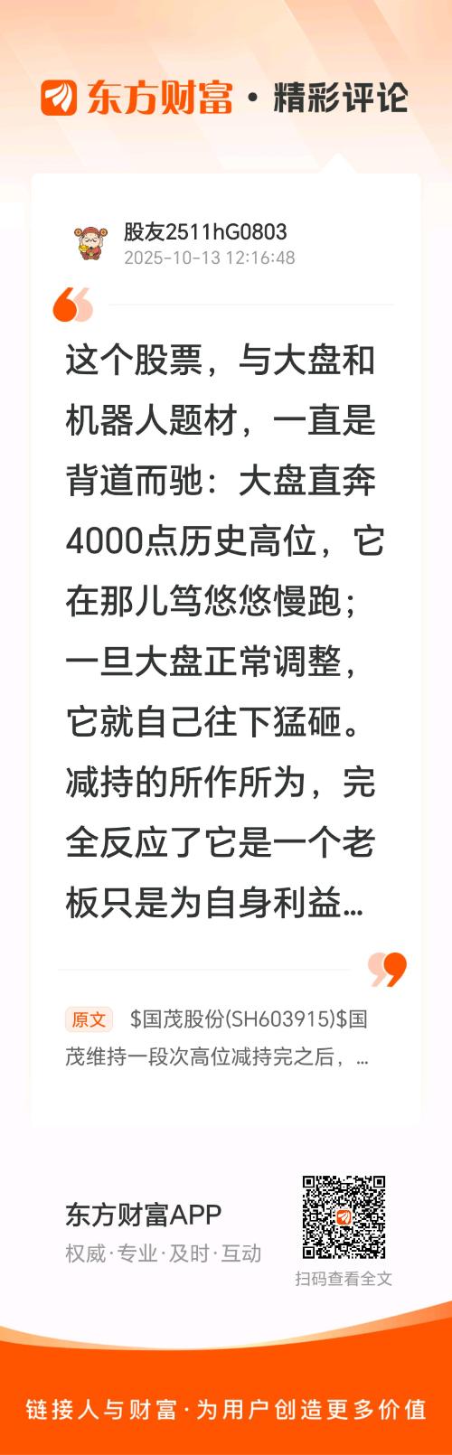 //@股友2511hG0803 :这个股票,与大盘和机器人题材,一直是背道而驰:大盘直奔4000点历史高位,它在那儿笃悠悠慢跑;一旦大盘正常调整,它就自己往下猛砸。减持的所作所为,完全反应了它是一个老板只是为自身利益小格局、没有投资价值的公司