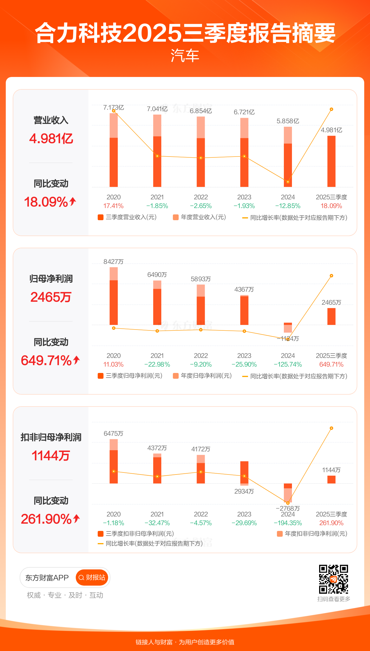合力科技10月30日发布2025年三季报显示,公司前三季实现营业收入4.98亿元,同比增长18.09%;归母净利润2465.19万元,同比增长649.71%;扣非归母净利润1143.69万元,同比增长261.90%。