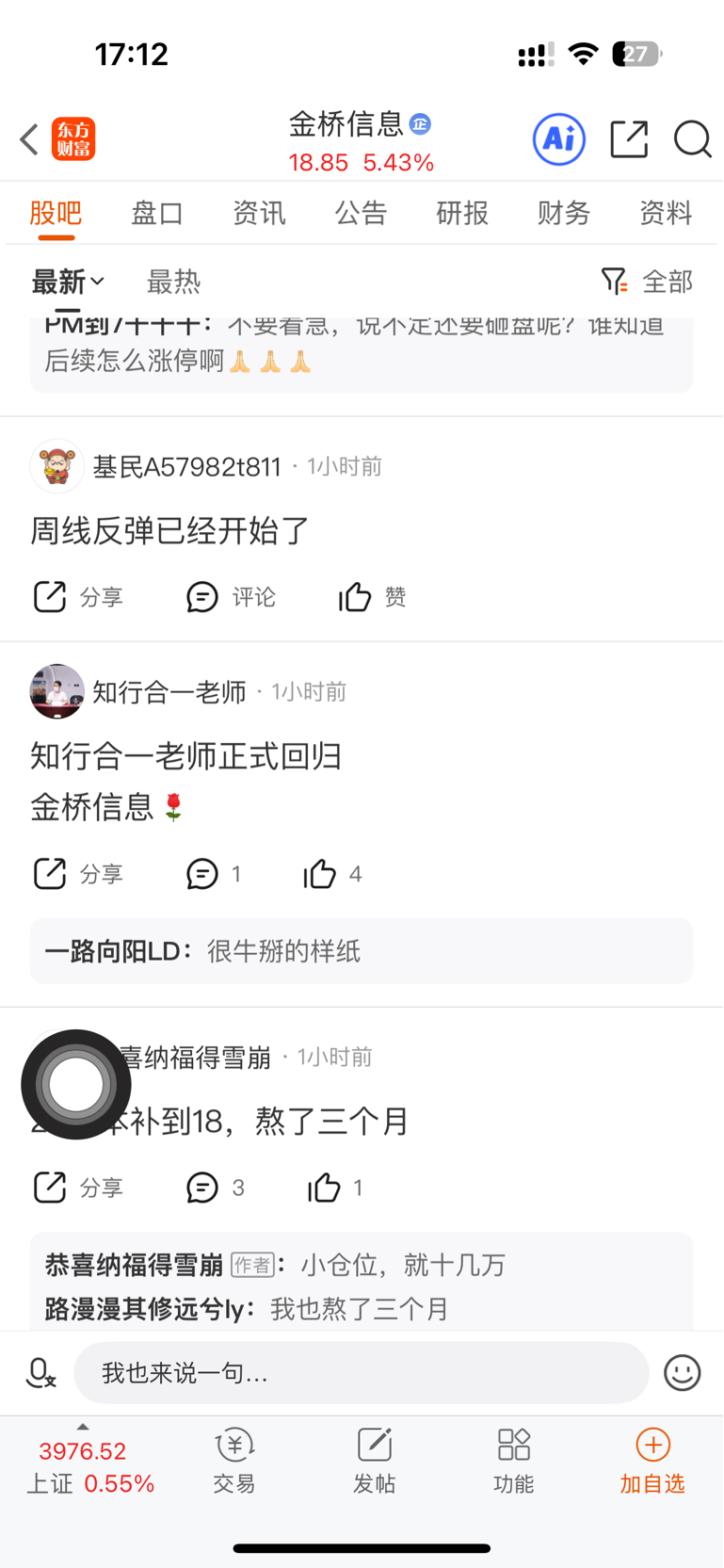 $金桥信息(SH603918)$ 完了,各位股神,这股有坏东西了,我之前买了东安动力,被这坏东西给坏透了,没想到初来此股,又碰到了