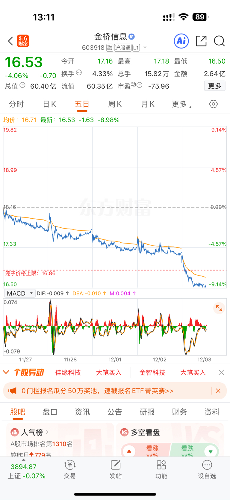 $金桥信息(SH603918)$ 16记得接回来,之前支撑位是16开始反弹