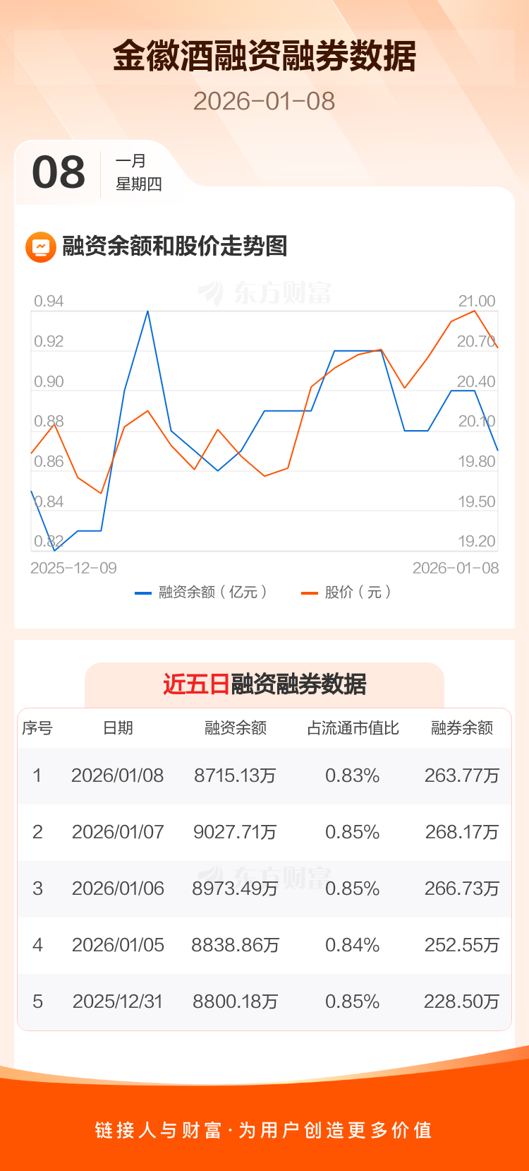 交易所最新数据显示,金徽酒于2026年1月8日获融资买入474.21万元,融资偿还786.79万元,当日融资净偿还312.58万元。目前,该股融资余额8715.13万,占流通市值比例为0.83%。