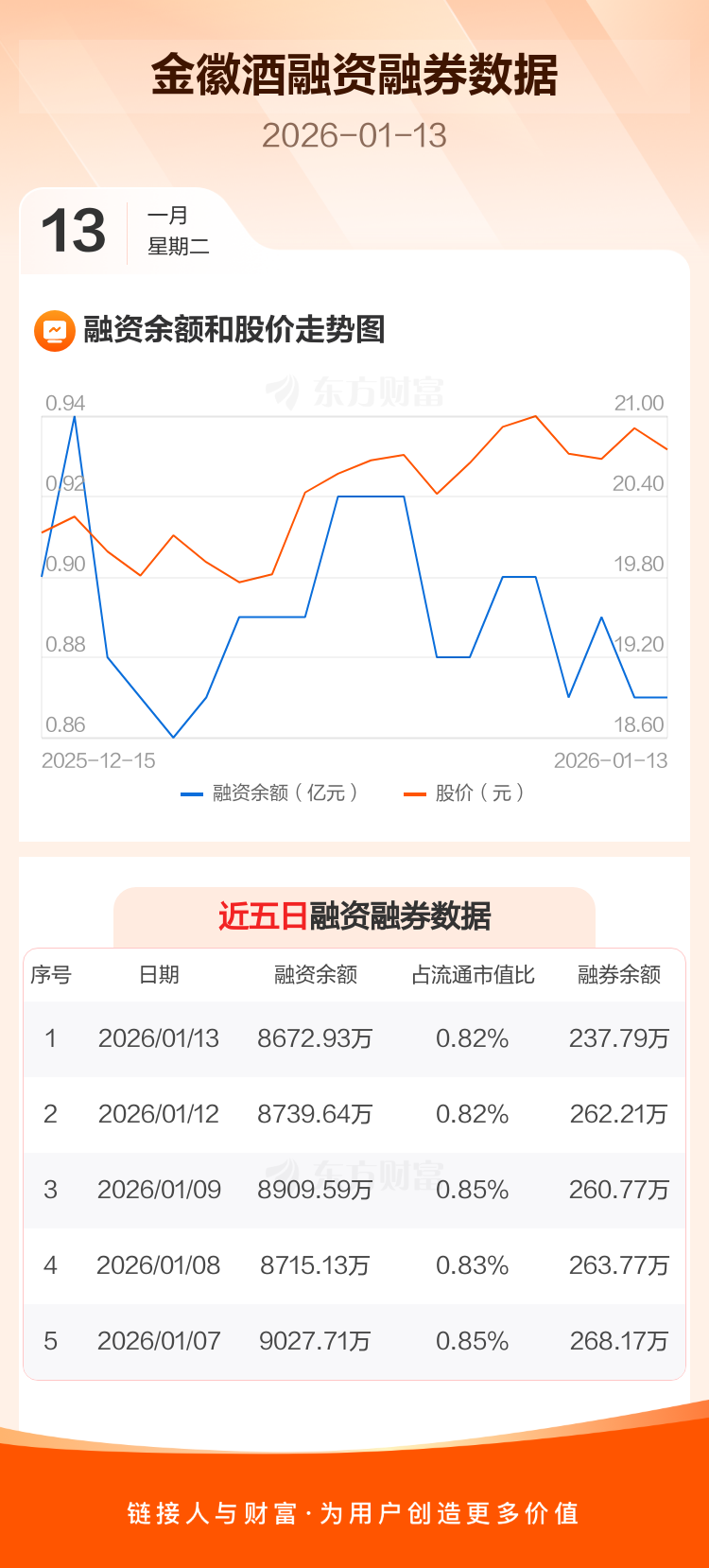 交易所最新数据显示,金徽酒于2026年1月13日获融资买入693.43万元,融资偿还760.14万元,当日融资净偿还66.71万元。目前,该股融资余额8672.93万,占流通市值比例为0.82%。