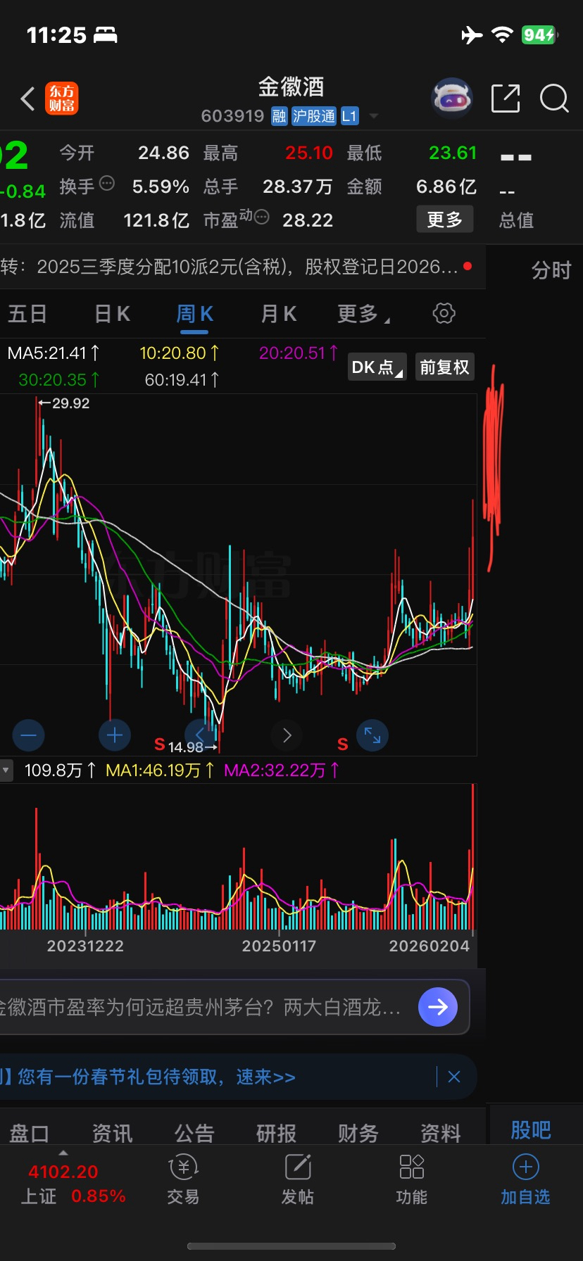 $金徽酒(SH603919)$ 老登股崛起叠加过年囤货概念!要信早信兄弟们!还来得及!年前上30左右卖!很简单对不对