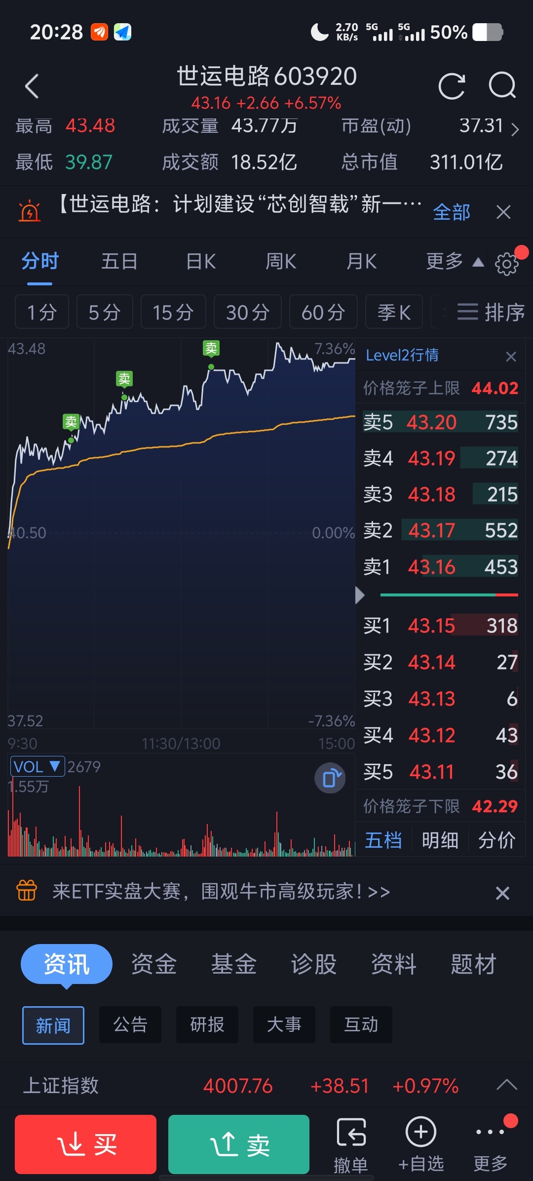 $世运电路(SH603920)$ 明天45谁要,我还有一点