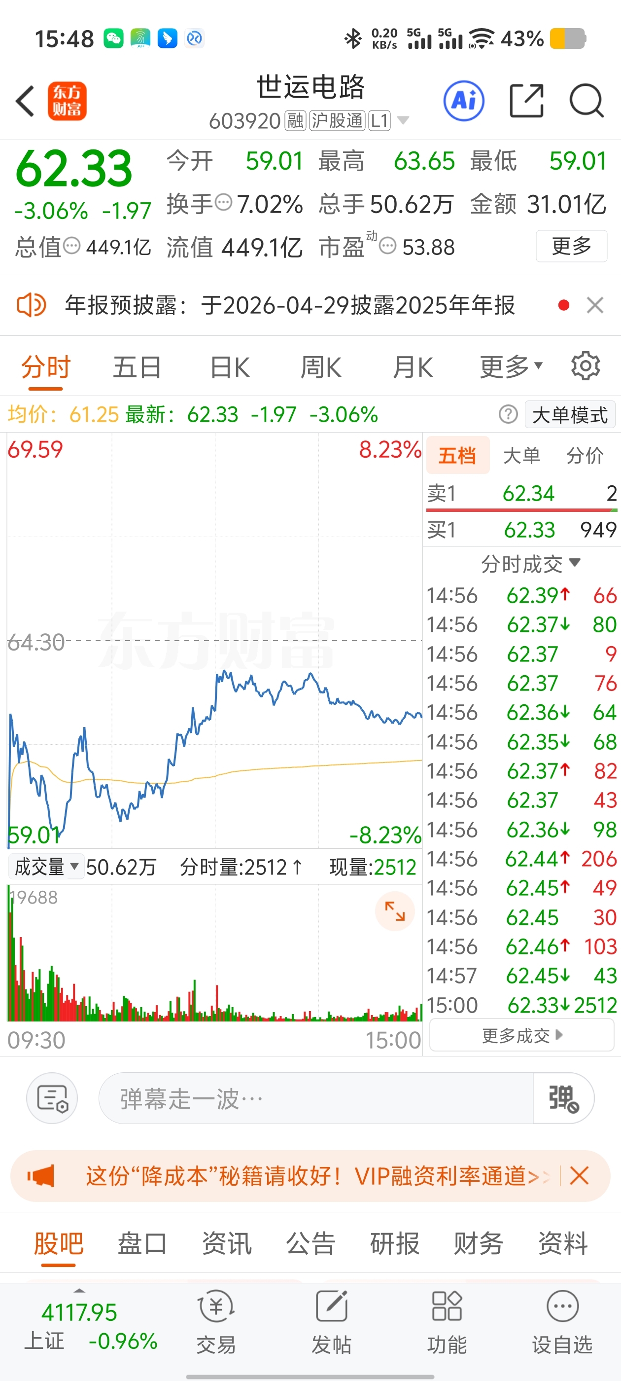 $世运电路(SH603920)$ 今天开盘给我砸停真是无语了,这种形态还是第一次见,陆续持有世运 快 2 年,其实他那属于就是那种波浪形回调上涨的票吧,挺漂亮了,虽然是迷你仓,持有体验很好,虽然在涨多,我也发不了大财,但希望本金厚底仓多的大家能发大财