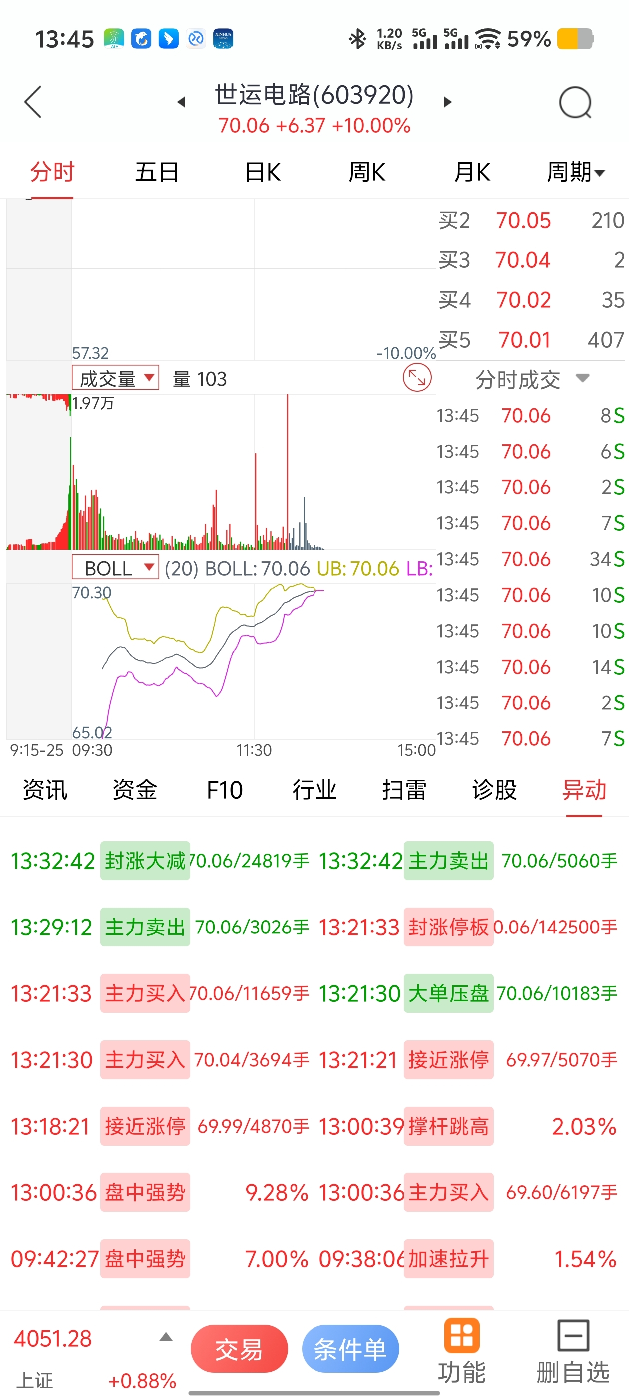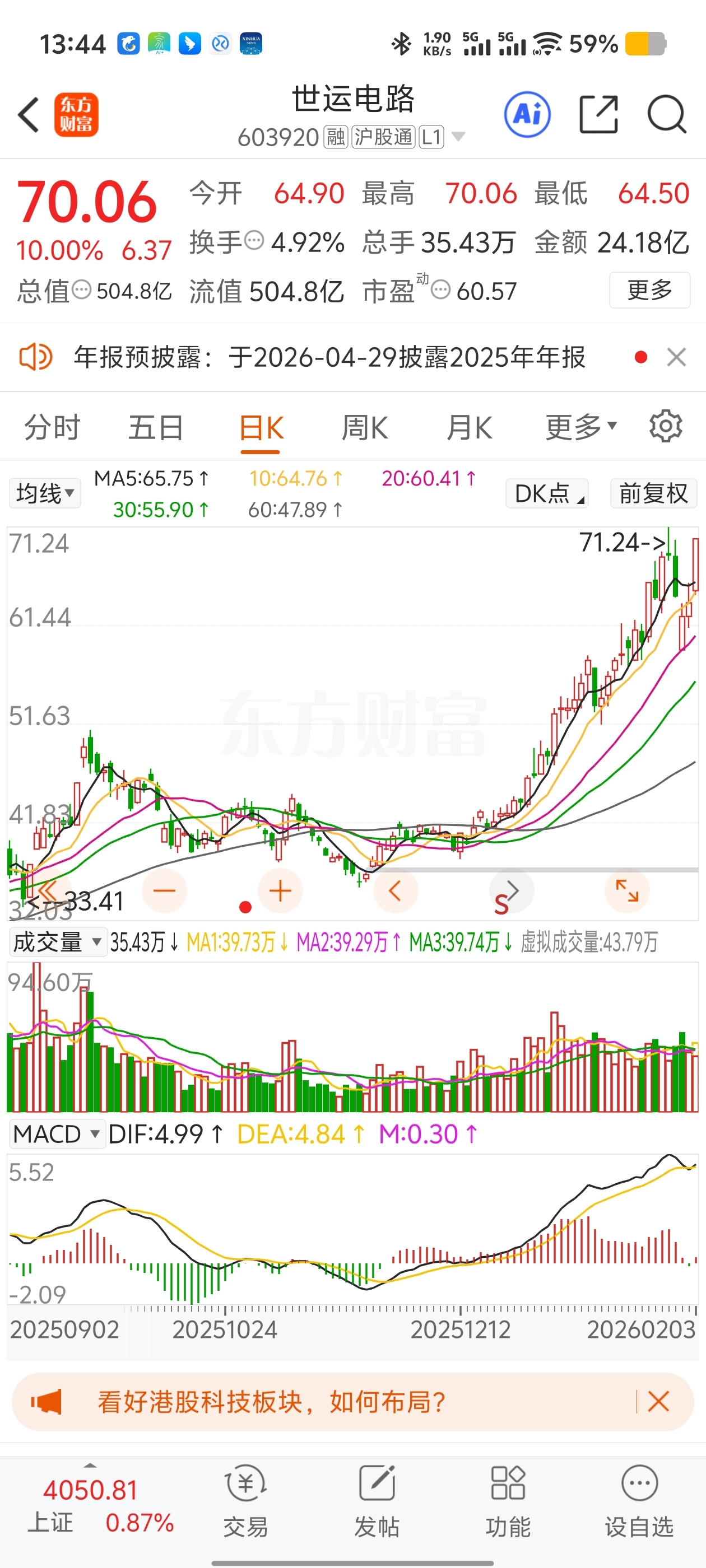 $世运电路(SH603920)$ 前两个月在三十五元附近让人煎熬了一下,然后判断一般 日内 5% 个的涨幅可以做t,结果后来涨到 40,就出了相当一部分,却没有接回来,真的没想到可以如此强势呐利用过往的信息来判断真的是不太可行。祝福在车上的朋友