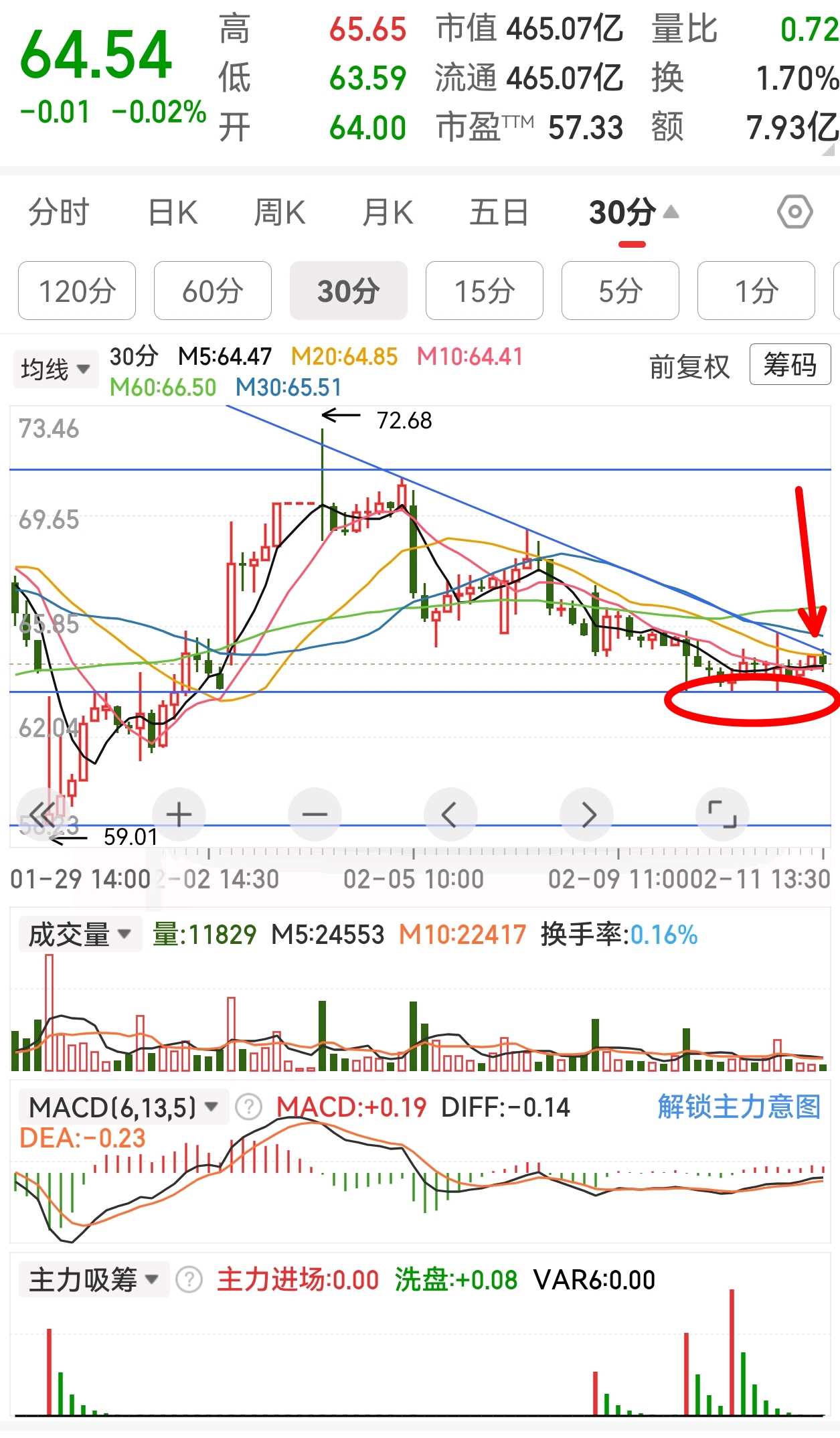 30分钟突破下降趋势再看,不能突破站稳或者有效跌破63.6都不用考虑。纯技术分析