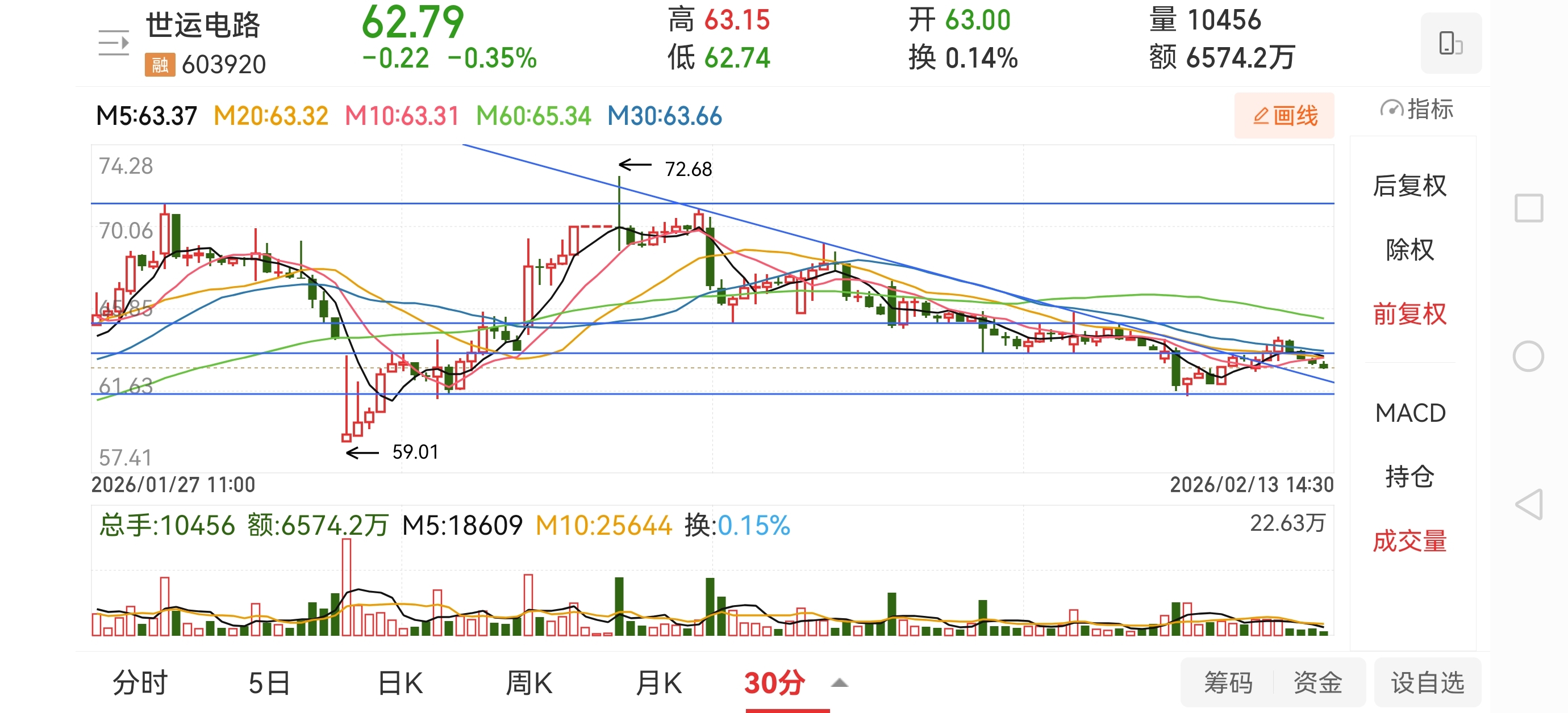 $世运电路(SH603920)$ 三十分钟已突破下跌趋势,而后随大盘回落进行回踩确认。