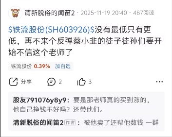 老铁股吧,之前从未说过一句,但应该对本人都不陌生;因为在11月20号前后,1420至1450附近,有人在老铁股吧连续发帖说:“蔡小韭在后院让拼命扫货,这么烂的票,他说观察区1820附近之下,拉升无阻力,要拿到2850之上,还让别人临时卖掉一点别的票,继续加仓,简直太可笑了,大家千万别买!”。经市场验证:这个发帖的人,不仅是蠢,更是坏!
