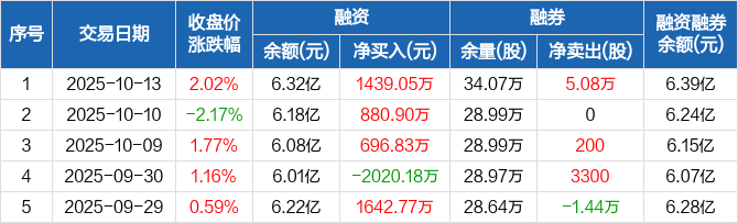 融资方面,当日融资买入6507.22万元,融资偿还5068.17万元,融资净买入1439.05万元,连续3日净买入累计3016.78万元。融券方面,融券卖出5.22万股,融券偿还1400股,融券余量34.07万股,融券余额722.33万元。融资融券余额合计6.39亿元。
