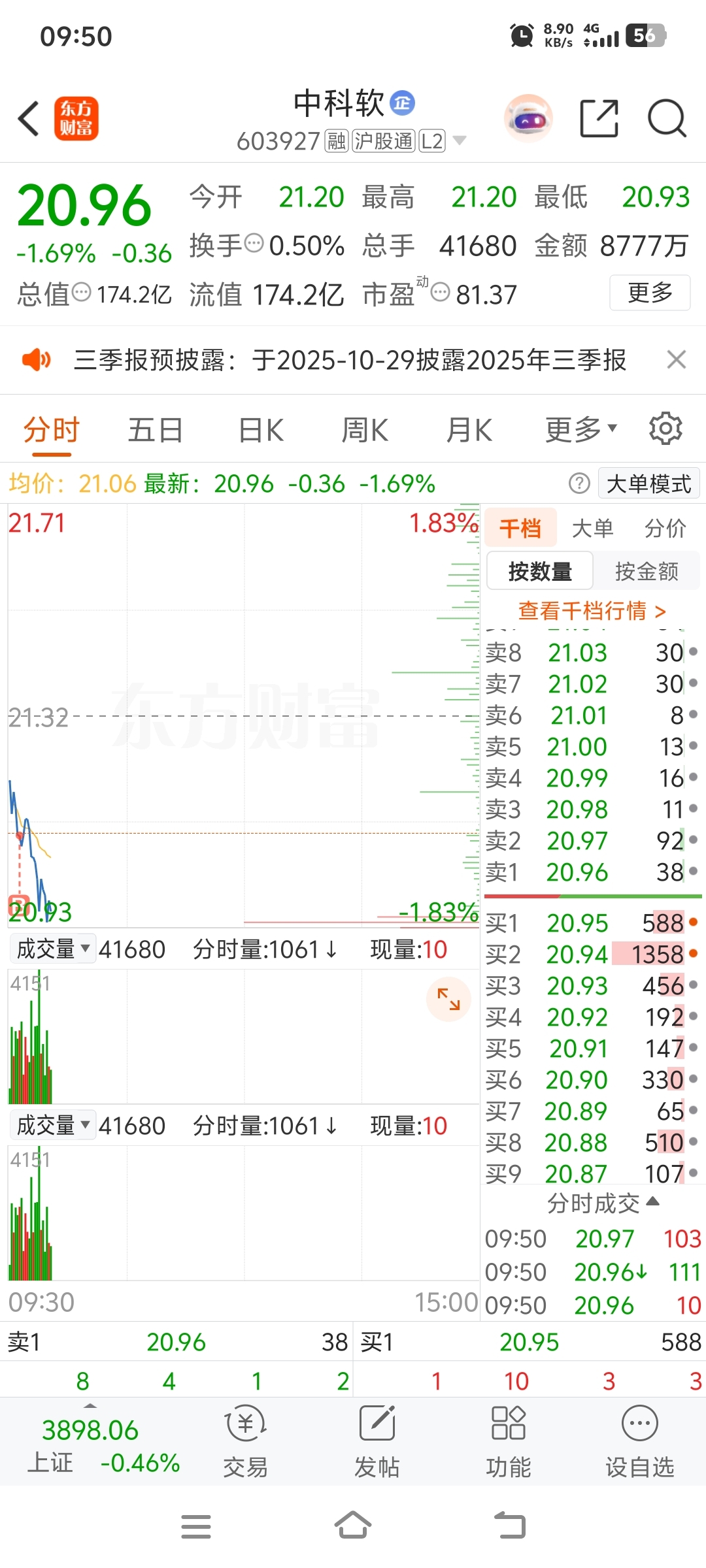 $中科软(SH603927)$ 进来就被套,谁说今天要涨的