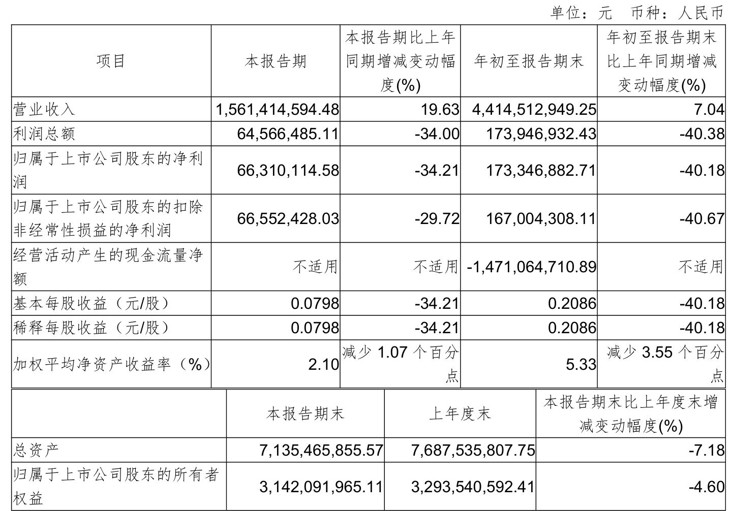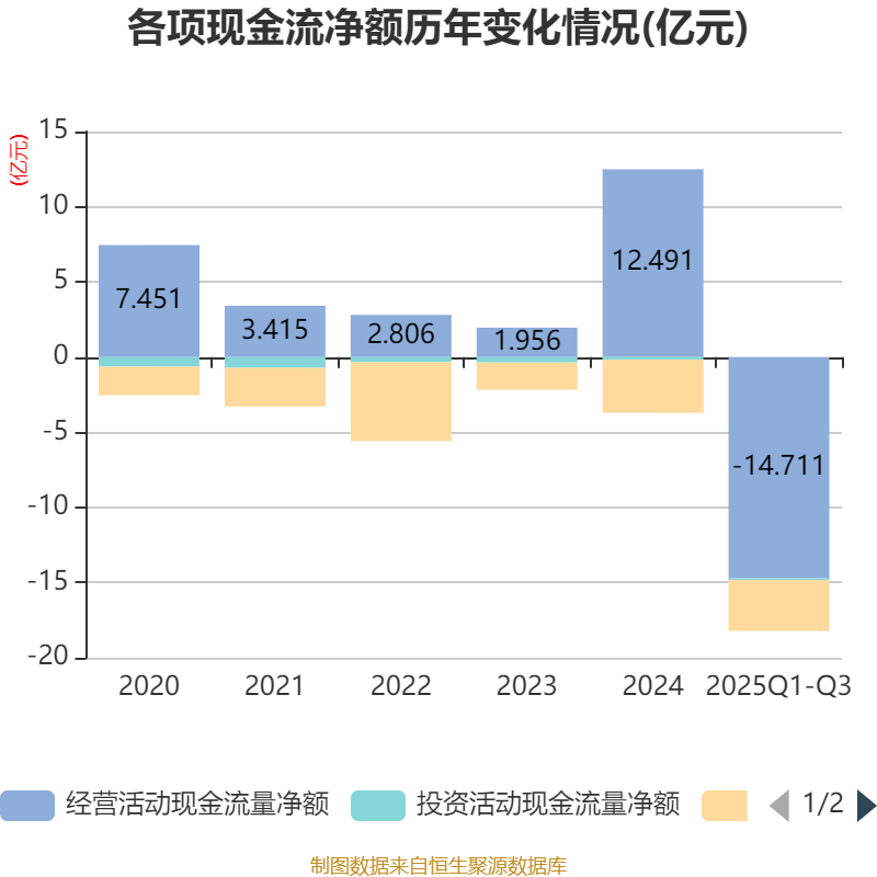 2025年前三季度,公司经营活动现金流净额为-14.71亿元,同比减少7.2亿元;筹资活动现金流净额-3.38亿元,同比增加844.97万元;投资活动现金流净额-1179.59万元,上年同期为-979.7万元。