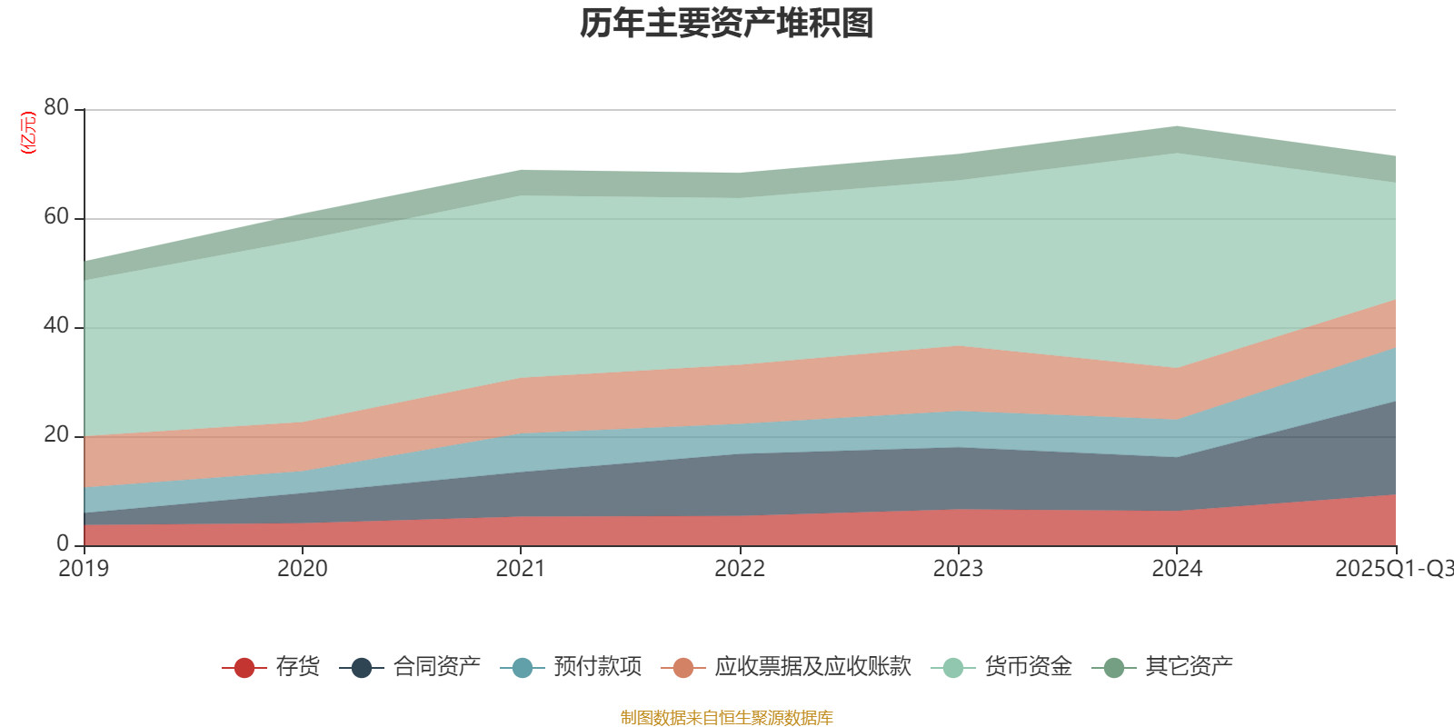 资产重大变化方面,截至2025年三季度末,公司货币资金较上年末减少45.6%,占公司总资产比重下降21.22个百分点;合同资产较上年末增加74.05%,占公司总资产比重上升11.21个百分点;存货较上年末增加47.64%,占公司总资产比重上升4.83个百分点;预付款项较上年末增加42.17%,占公司总资产比重上升4.78个百分点。