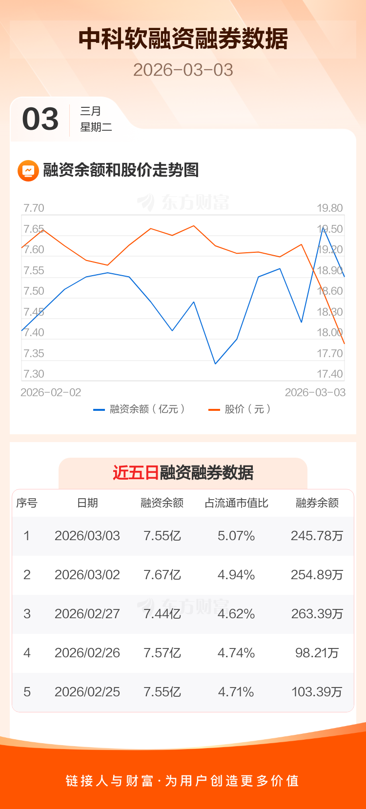 交易所最新数据显示,中科软于2026年3月3日获融资买入2694.56万元,融资偿还3925.51万元,当日融资净偿还1230.94万元。目前,该股融资余额7.55亿,占流通市值比例为5.07%。