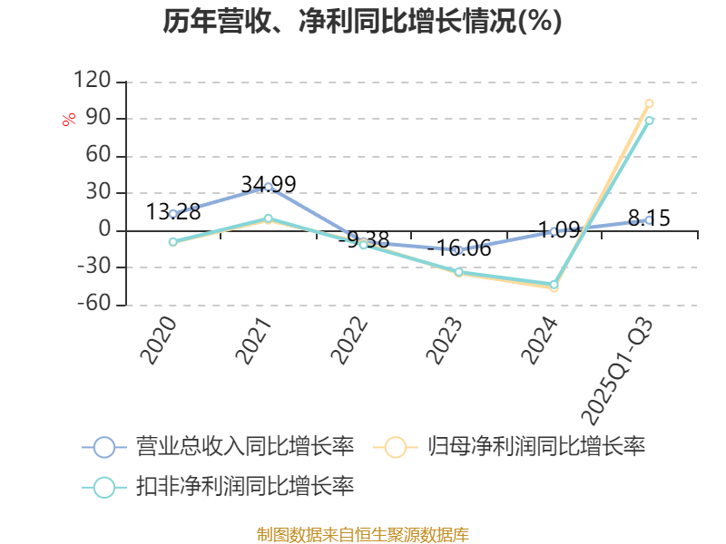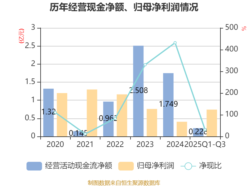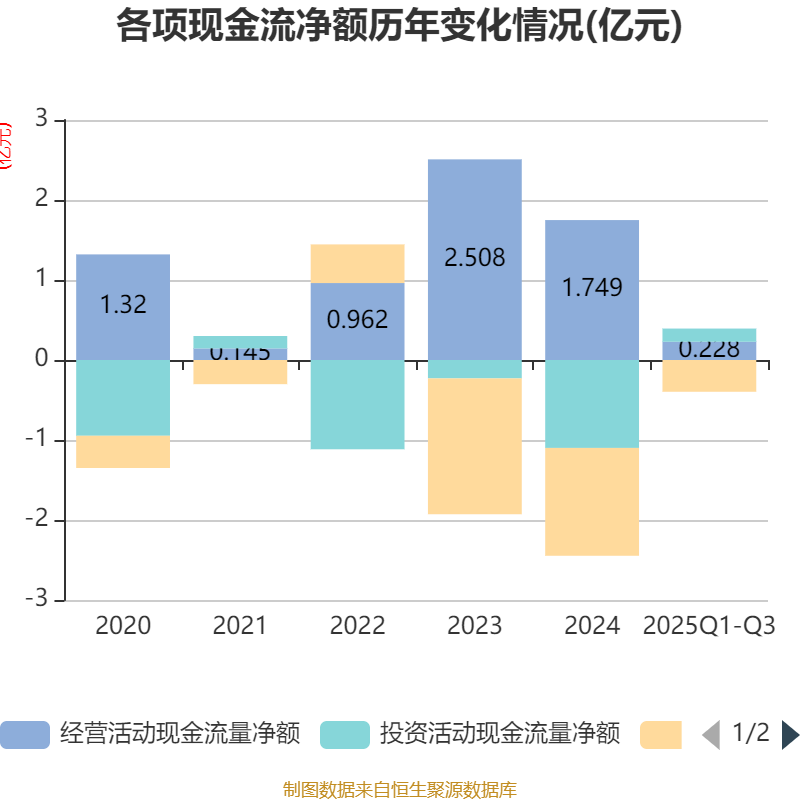 2025年前三季度,公司经营活动现金流净额为2278.24万元,同比下降77.91%;筹资活动现金流净额-3972.95万元,同比增加9502.21万元;投资活动现金流净额1645.63万元,上年同期为-2988.43万元。