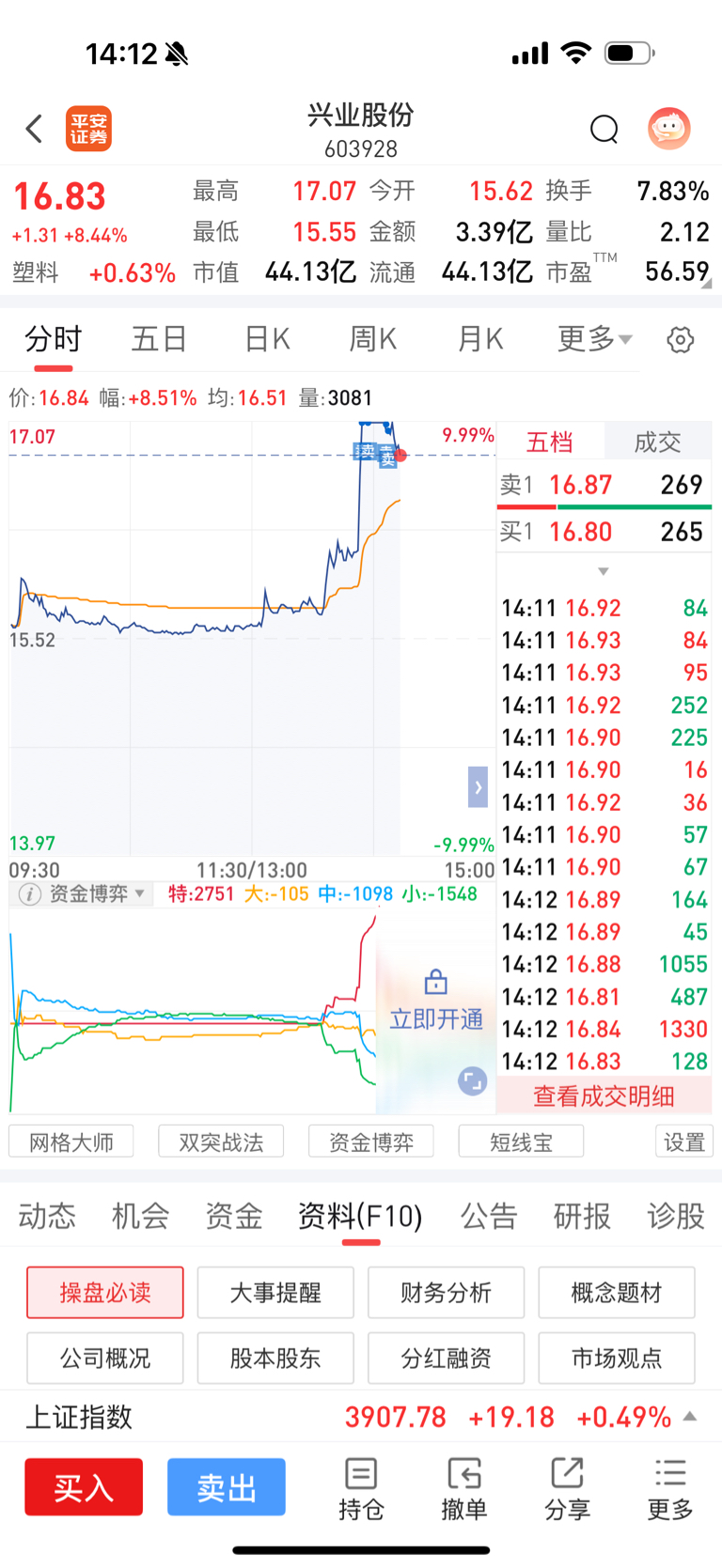 $兴业股份(SH603928)$ 涨停卖完了,感觉被摇出去了