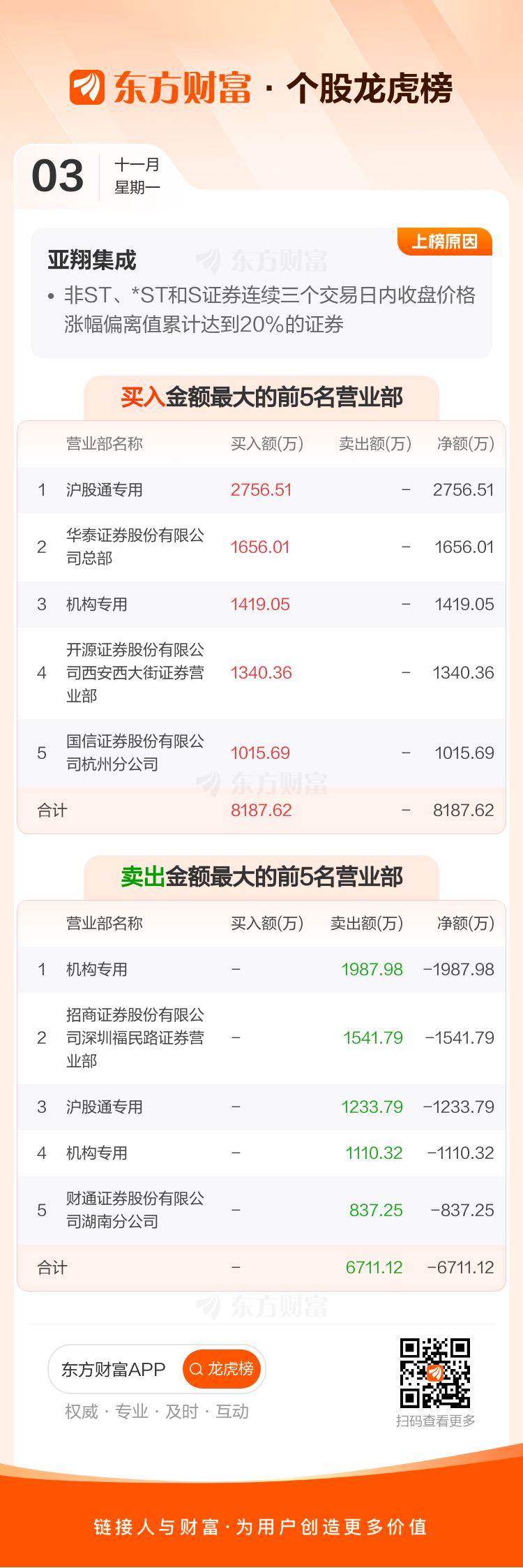 交易所2025年11月3日公布的交易公开信息显示,亚翔集成因成为非ST、*ST和S证券连续三个交易日内收盘价格涨幅偏离值累计达到20%的证券上榜。亚翔集成当日收报46.71元,涨跌幅10.01%,换手率2.15%,成交额2.11亿。异常期间10月31日至11月3日,期间涨幅21.01%,累计偏离值21.27%,区间成交额3.75亿。